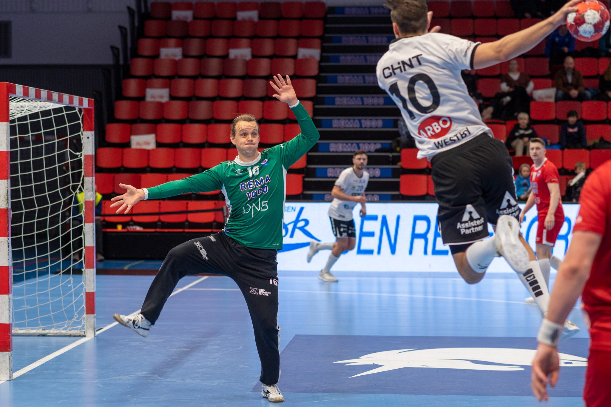 Men i dag var det en av få kamper hvor det ble en del nesten-redninger. På stillingen 7-7 etter et kvarters spill valgte Gomo/Samdahl å bytte målvakt. Inn kom Simen, startet med en straffe-redning og fortsatte å stå i veien for Drammen-skudd. Til pause var redningsprosenten 50 og et godt stykke ut i andreomgang var prosenten enda høyere. Til slutt endte han (i mine notater) med 48 prosent redning. Blant de 13 redningene var tre fra 7-meteren! Fantastisk!