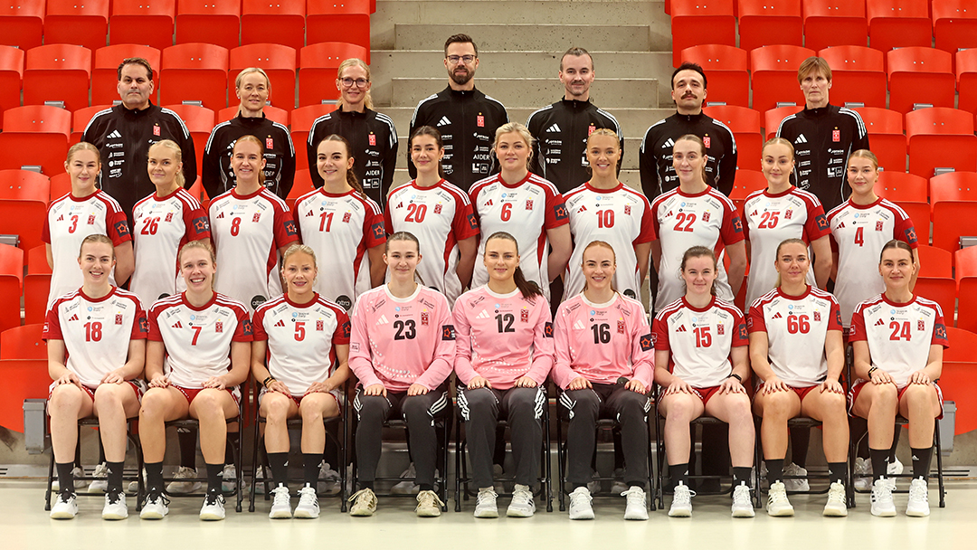 Larvik HK 2025/26. Foran f.v.: Tirill Mørch, Sara Berg, Kine Kvalsund, Christine Strøm, Dina Frisendal, Lea Løkke-Øwre, Guro Ramberg, Christina Pedersen, Amanda Kurtović. Midten f.v.: Mari Stensrud, Maja Furu Sæteren, Martine Wolff, Frøydis Seierstad, Ingrid Vinjevoll, Constance Hedenstad, Julie Hulleberg, Andrea Rønning, Tiril Rosenberg, Charlotte Iversen. Bak f.v.: Thomas Bråthen, Hege Marie Hansen, Annette Tveter, Henrik Signell, Tom Erik Hansen, Emil Martinovic, Lene Rantala. Foto: Svein André Svendsen