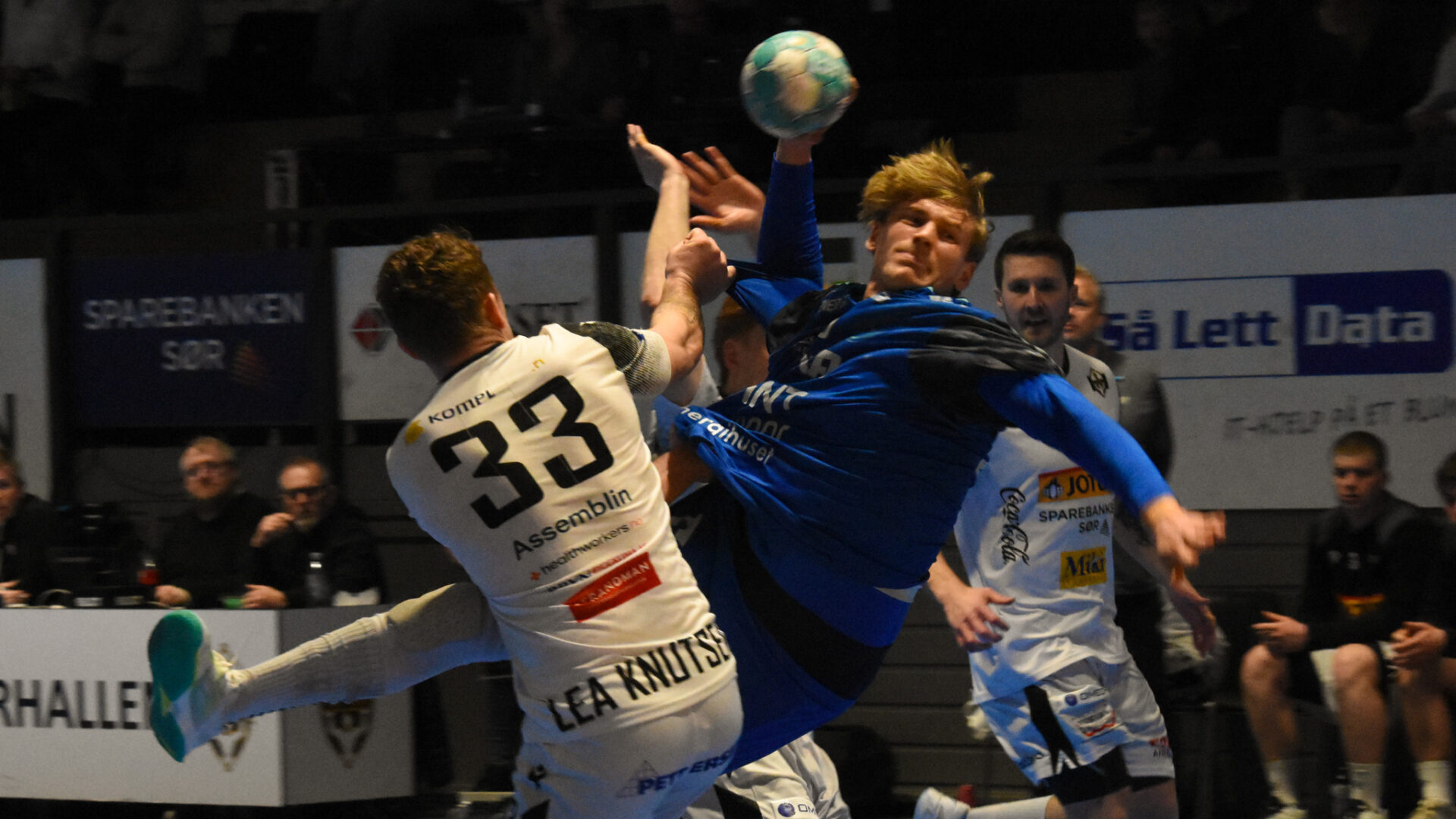 DHK -spillerne merket på kroppen at de hadde møtt et fysisk sterkt Runar-lag denne onsdagskvelden. Her treffer Viktor Petersen Norberg på Tord Lea Knutsen (t.v.) og Tobias Rivesjø.