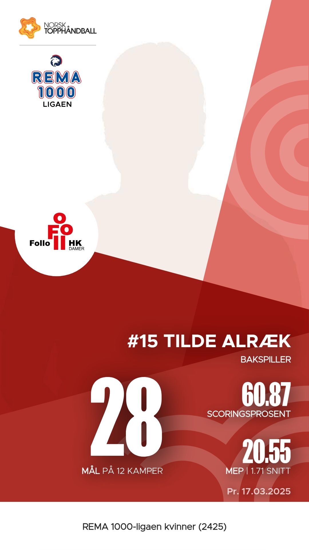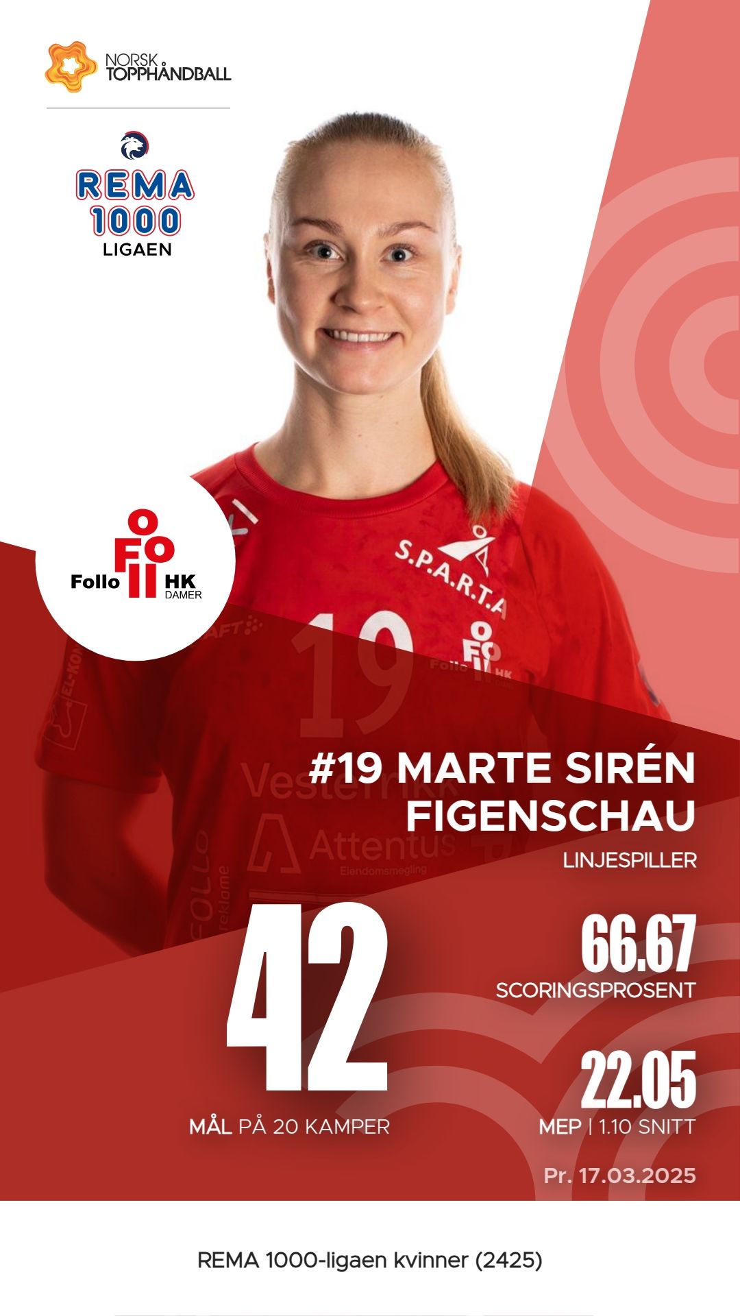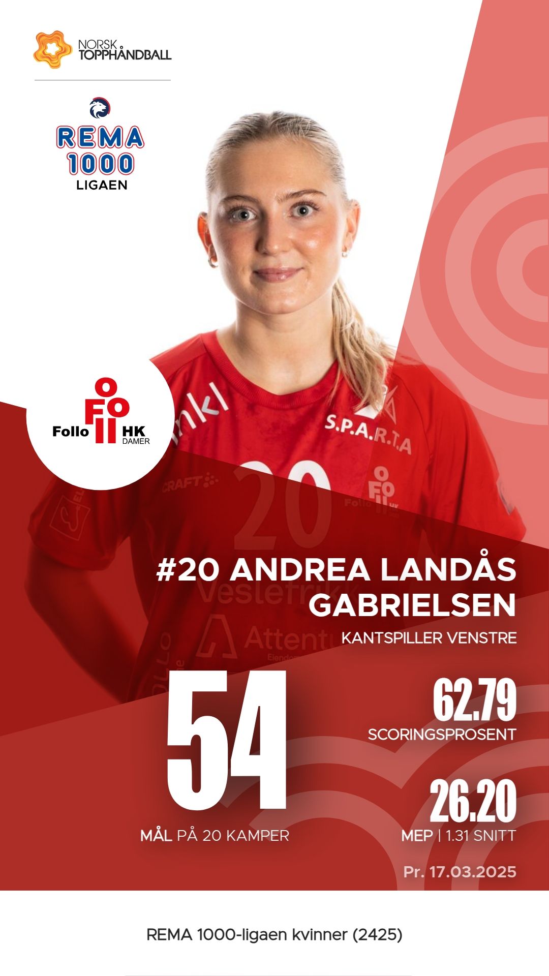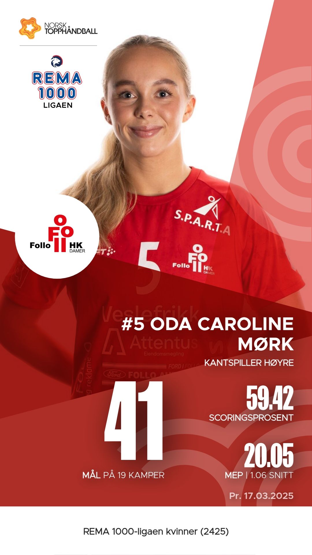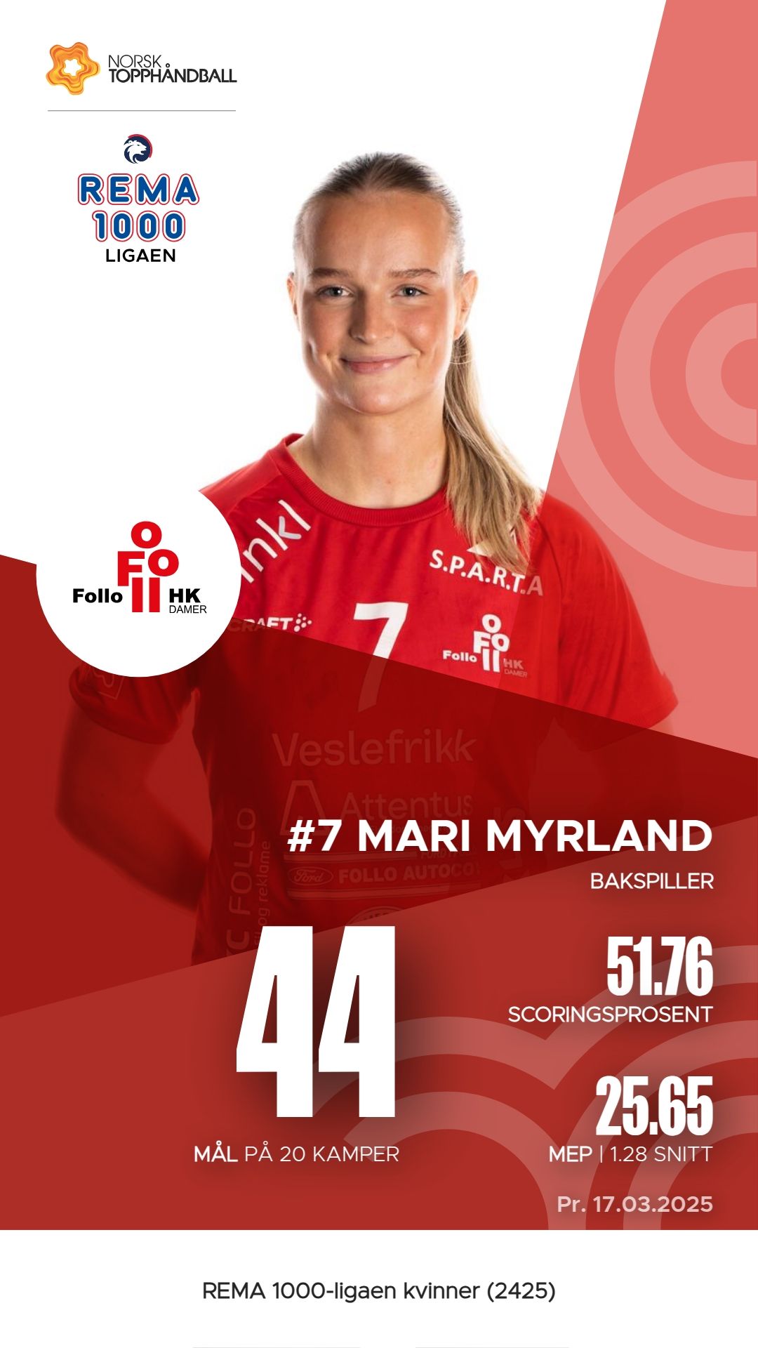 I Follo Damer har flere spillere utmerket seg i REMA 1000-ligaen kvinner denne sesongen. Andrea Landås Gabrielsen har scoret 54 mål på 86 skudd, noe som gir en effektivitet på 62,8%. Mari Myrland følger tett med 44 mål og imponerende 55 målgivende pasninger. Oda Caroline Mørk og Tilde Alræk har også hatt en solid sesong, henholdsvis med 41 mål og 30 assists. I tillegg viser Marte Sirén Figenschau en god allsidighet med 42 mål og 5 assists. Disse spillerne har vært avgjørende for lagets prestasjoner så langt.