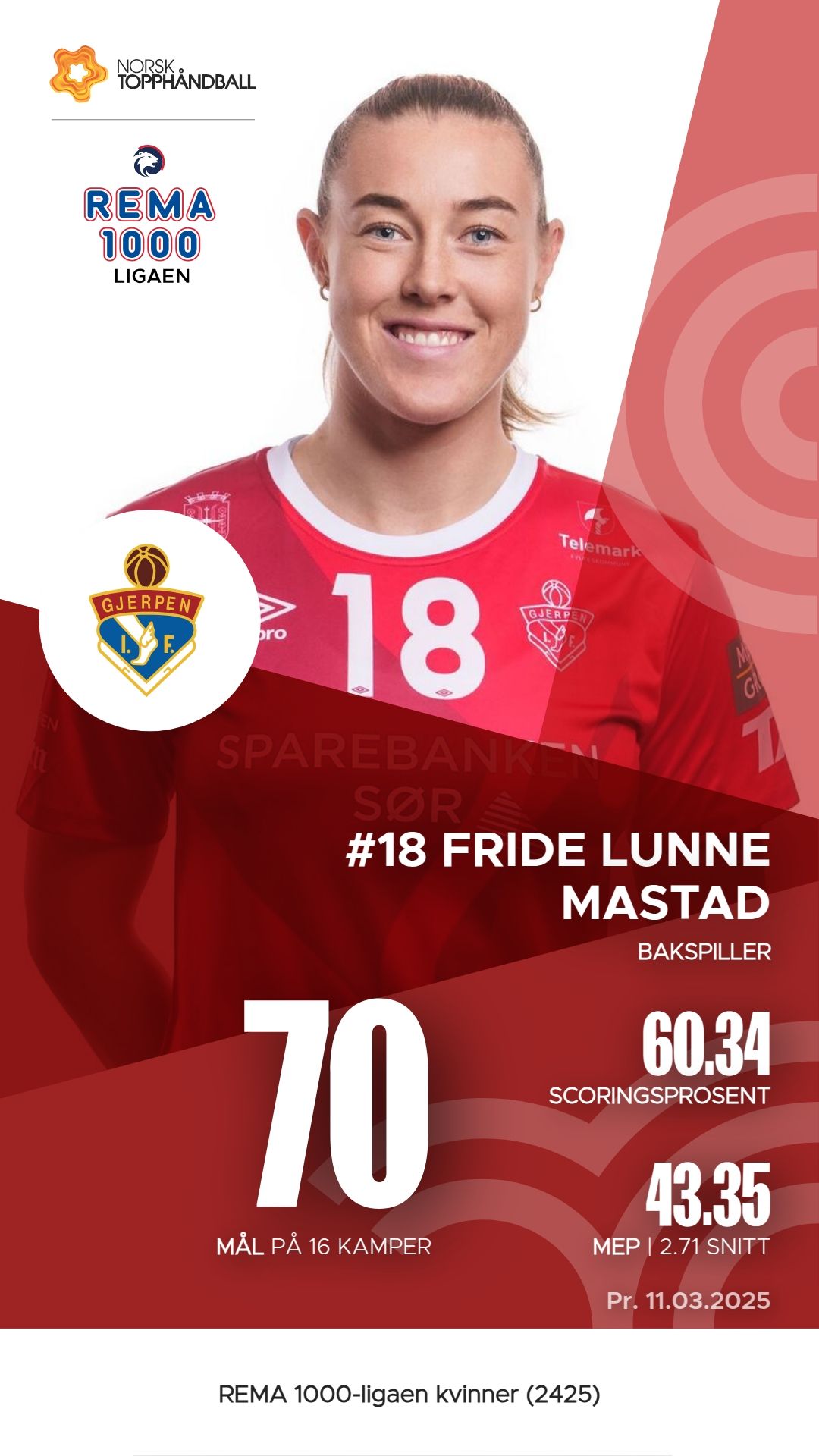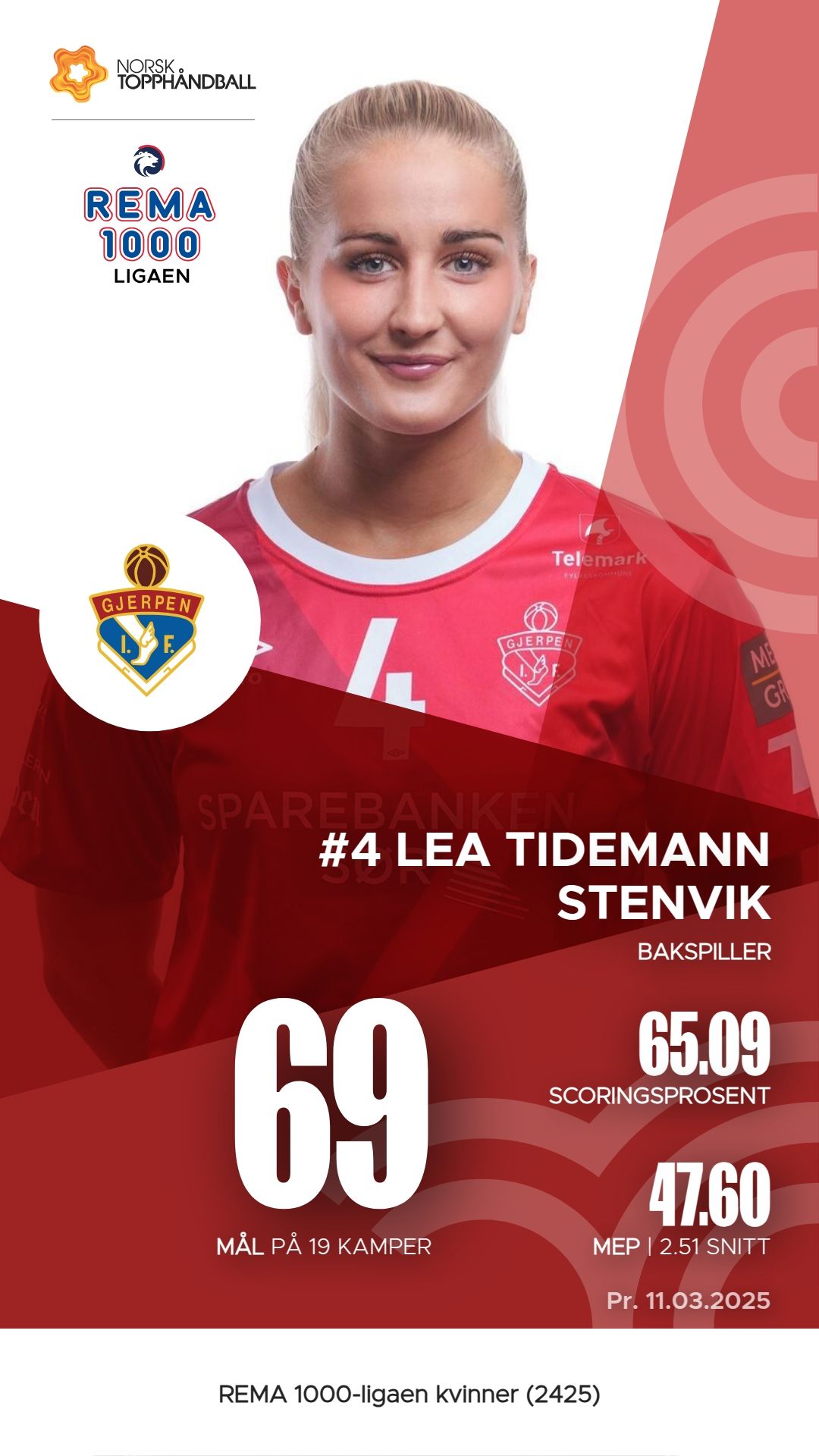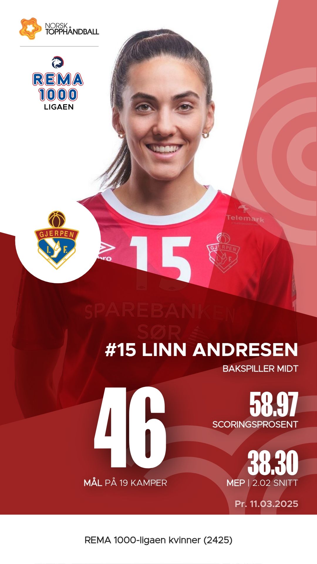 Gjerpen har flere fremstående spillere som har bidratt sterkt til lagets prestasjoner denne sesongen. Fride Lunne Mastad har scoret 70 mål på 116 skudd, samt registrert 46 assists, noe som gjør henne til en av lagets mest produktive spillere med en M.E.P. på 43,35. Lea Tidemann Stenvik følger tett etter med 69 mål og hele 57 assists, og en M.E.P. på 47,6, noe som viser hennes offensive styrke. Linn Andresen har også imponert med 46 mål og 82 assists, og har en M.E.P. på 38,30. Disse spillerne har vært avgjørende for Gjerpens angrepsspill.