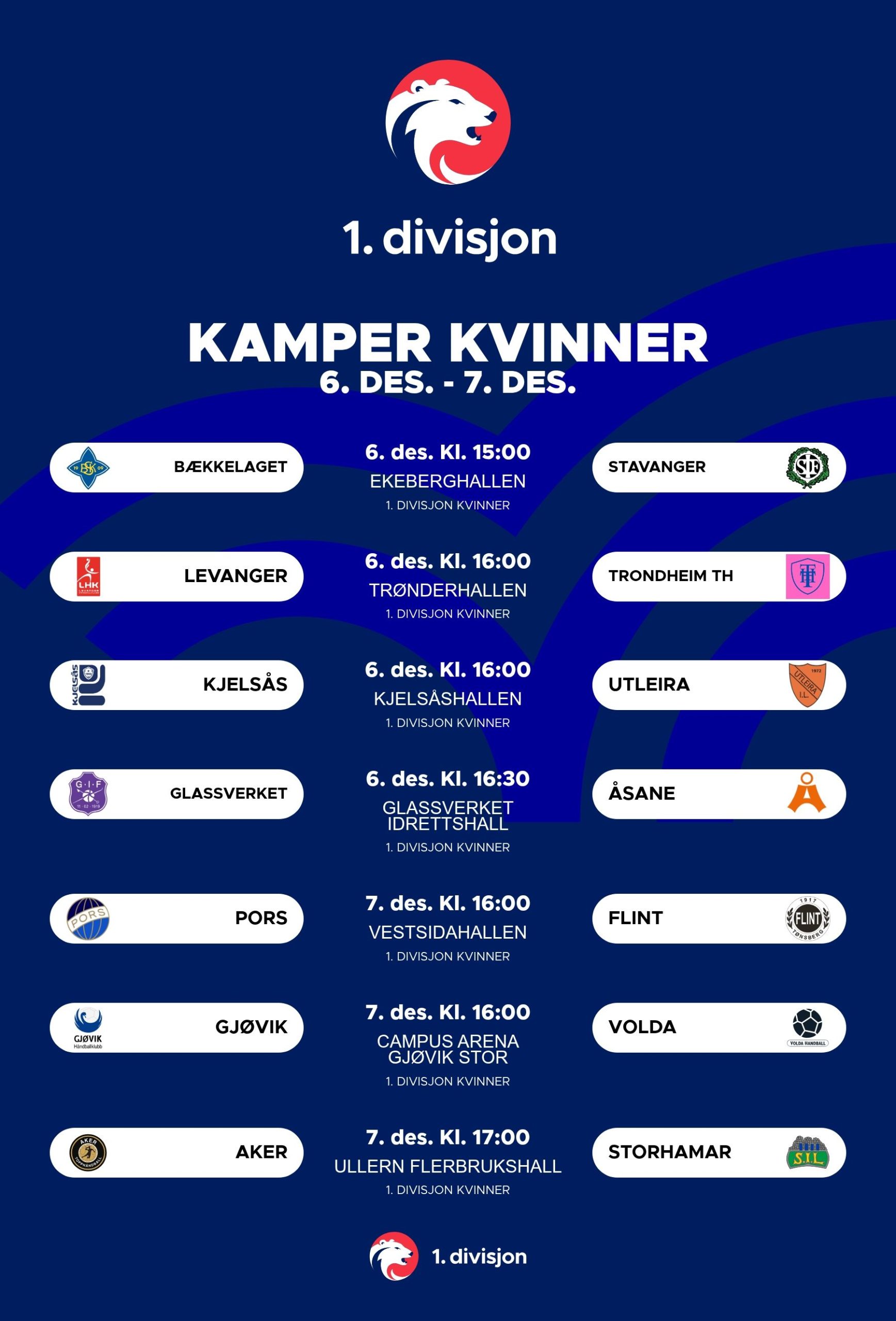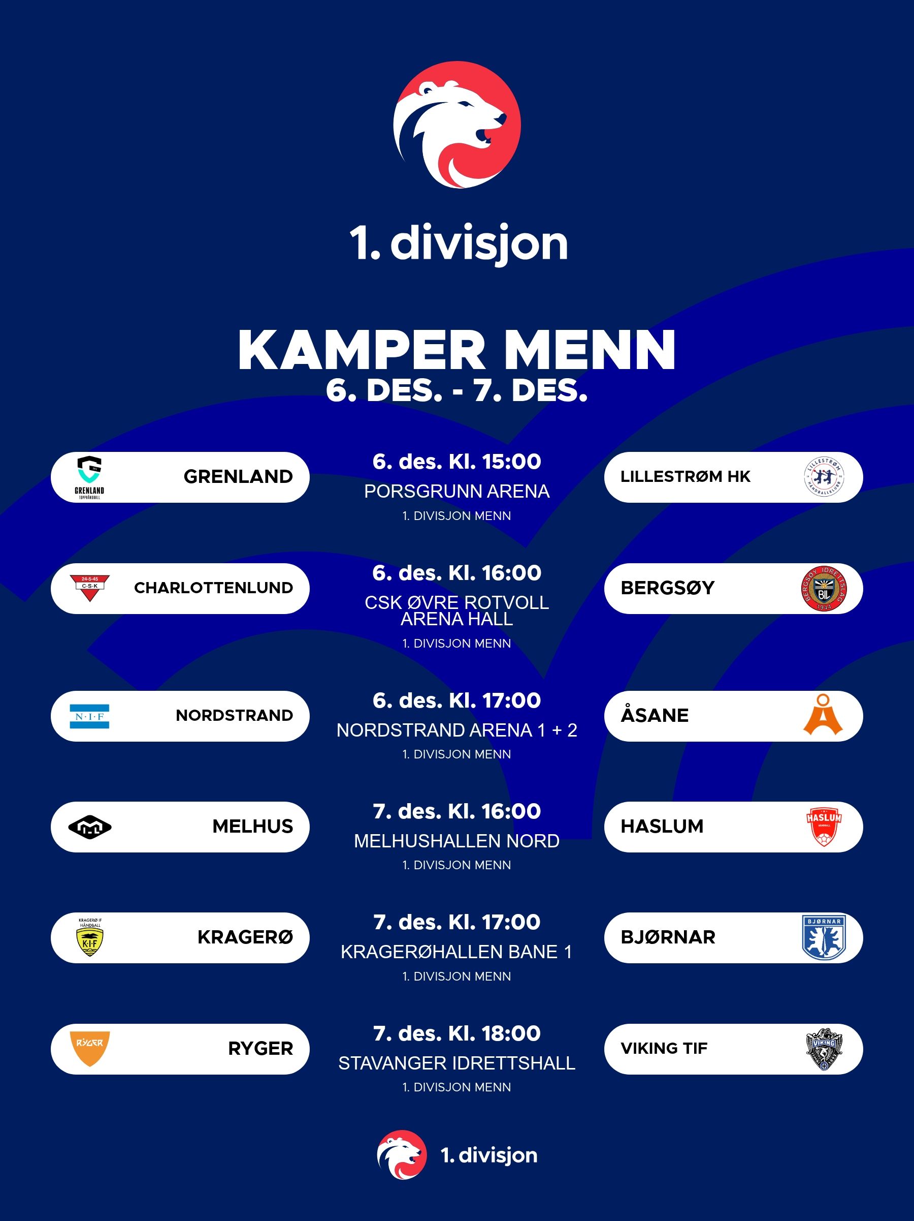 Her finner du oversikten over hvor og når kampene i 1. divisjon kvinner og menn spilles i helgen.