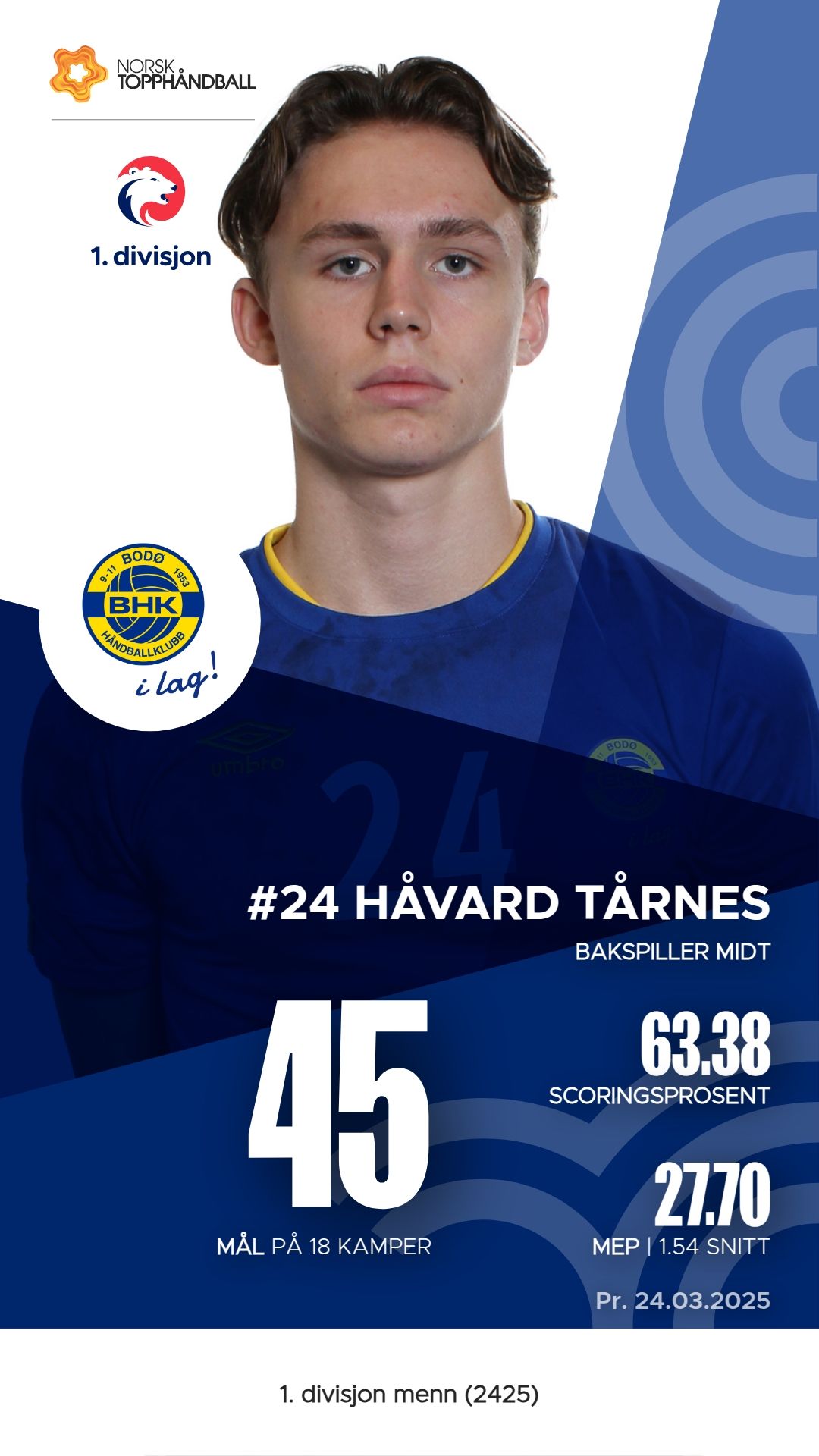 Bodø håndball har flere fremragende spillere som har bidratt betydelig til lagets prestasjoner denne sesongen. Gustav Andreas Halvorsen er en av de mest effektive spillerne med 78 mål på 111 skudd, noe som gir ham en M.E.P. på 45,75. Thomas Lie har også utmerket seg med 38 mål og hele 59 assists, noe som resulterer i en M.E.P. på 31,35. Håvard Tårnes har bidratt med 45 mål og 21 assists, og har en M.E.P. på 27,7. Disse spillerne har vært avgjørende for Bodøs suksess i 1. divisjon menn.