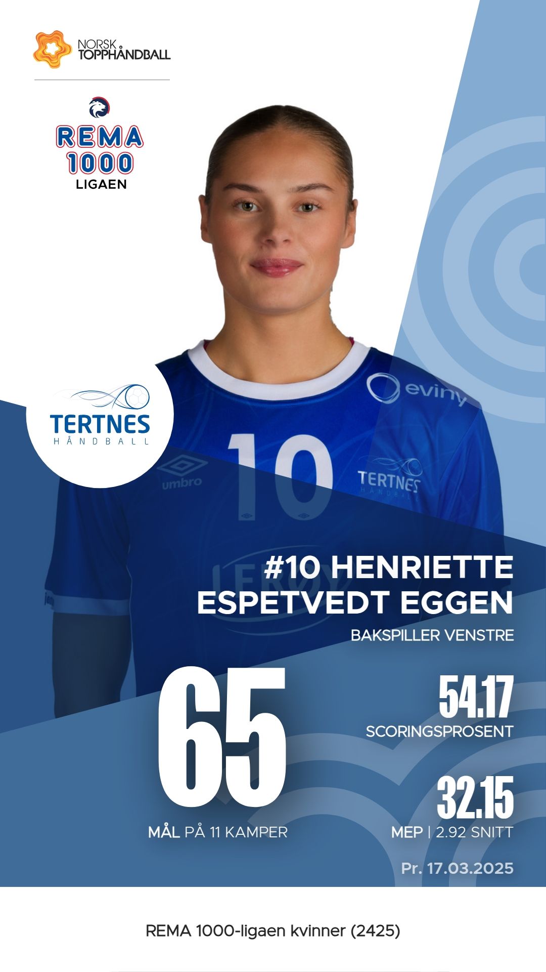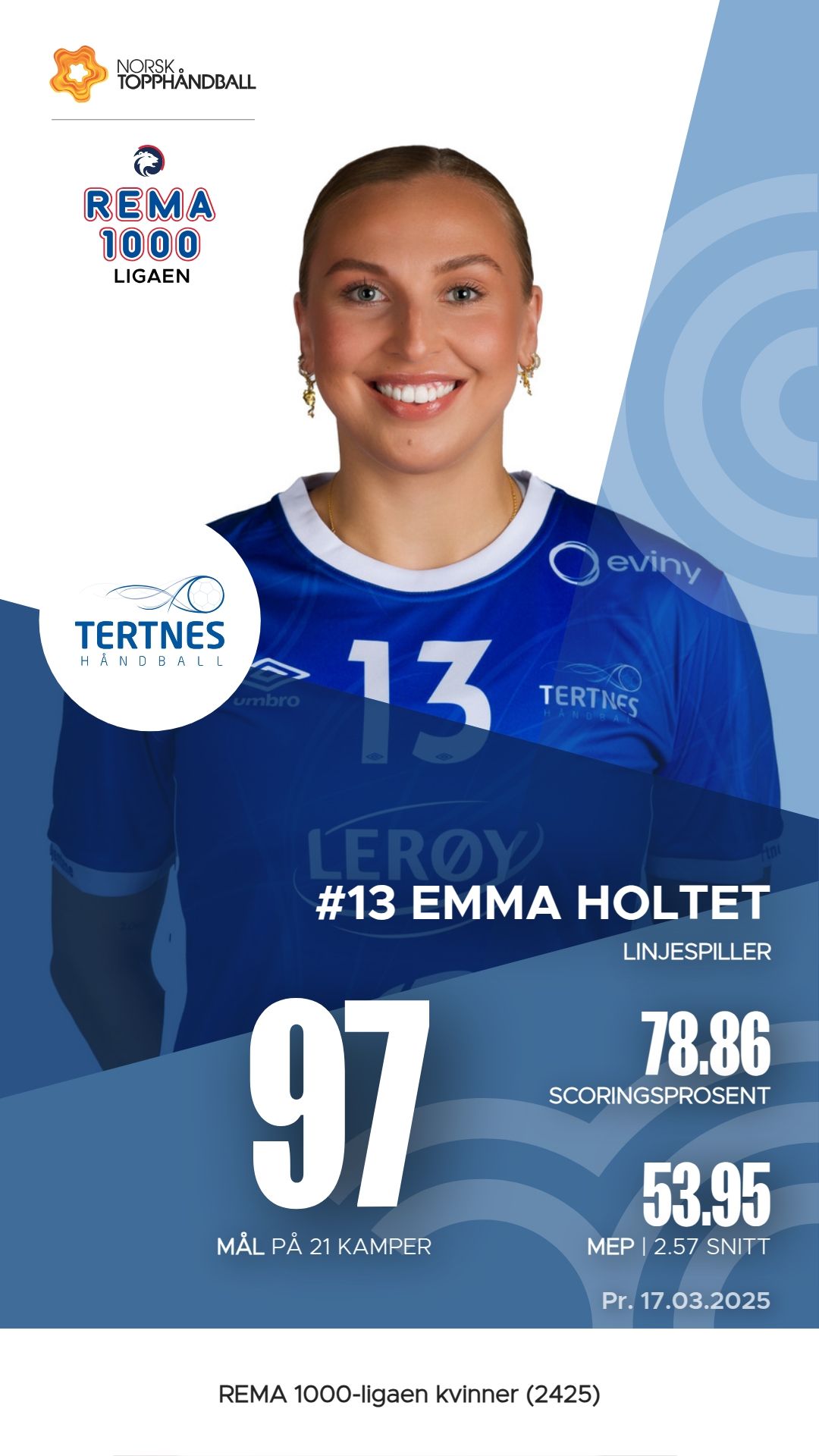 Tertnes har flere nøkkelspillere som har utmerket seg i sesongen. Emma Holtet har scoret 97 mål på 123 skudd, noe som gir henne en M.E.P. på 53,95. Birgitte Karlsen Hagen har også hatt en solid sesong med 67 mål og hele 59 assists, som resulterer i en M.E.P. på 38,50. Henriette Espetvedt Eggen har bidratt med 65 mål og 24 assists, med en M.E.P. på 32,15. Disse spillerne har vært sentrale i Tertnes’ angrepsspill og har vist god effektivitet i kampene.