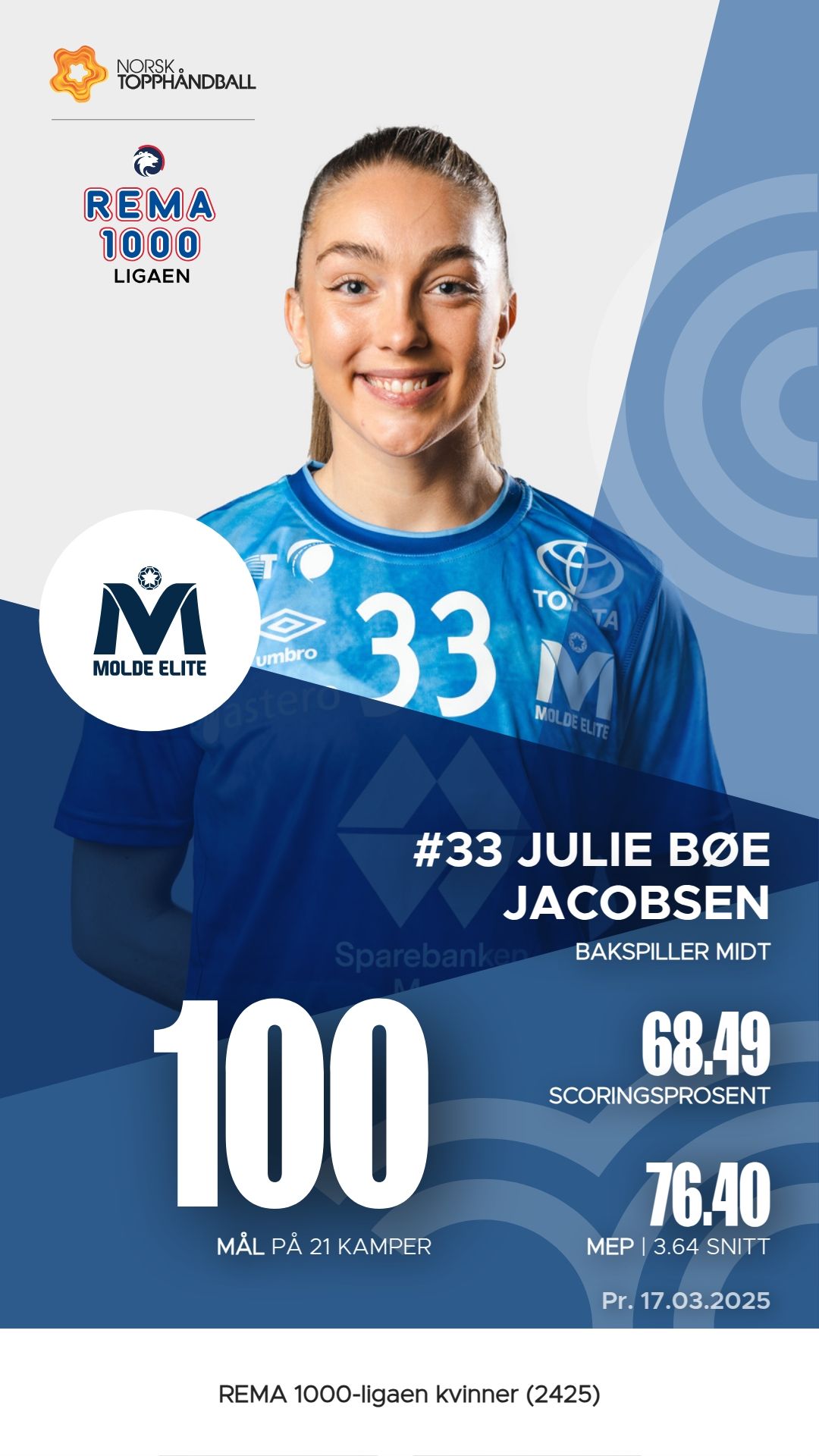 Molde har flere fremtredende spillere som har utmerket seg i REMA 1000-ligaen kvinner denne sesongen. Julie Bøe Jacobsen leder laget med 100 mål og 84 assists, noe som gir henne en M.E.P. på 76,4. Celina Vatne følger etter med 67 mål og 50 assists, og en M.E.P. på 35,4. Lene Kristiansen Tveiten har også vist styrke med 63 mål og 44 assists, som resulterer i en M.E.P. på 40,3. Disse spillerne har vært avgjørende for Moldes prestasjoner i ligaen så langt.