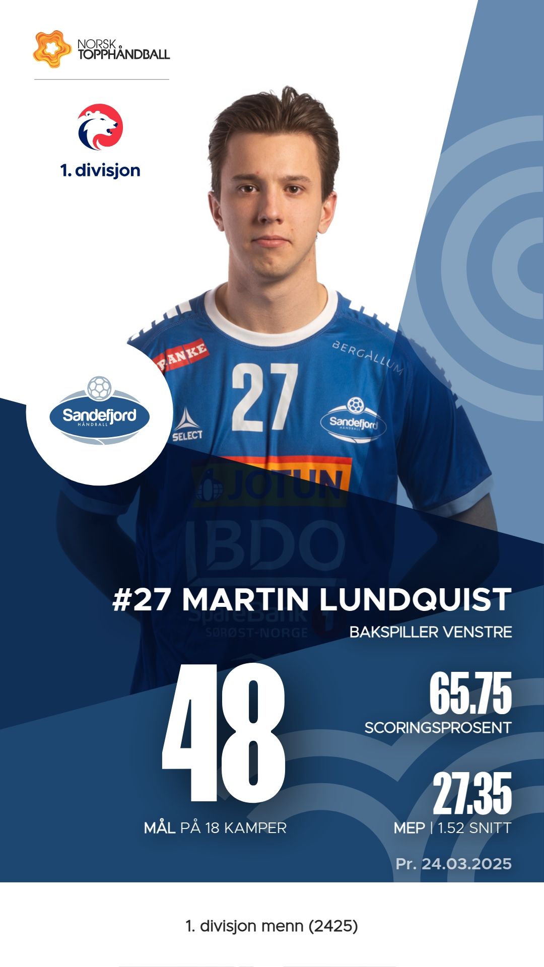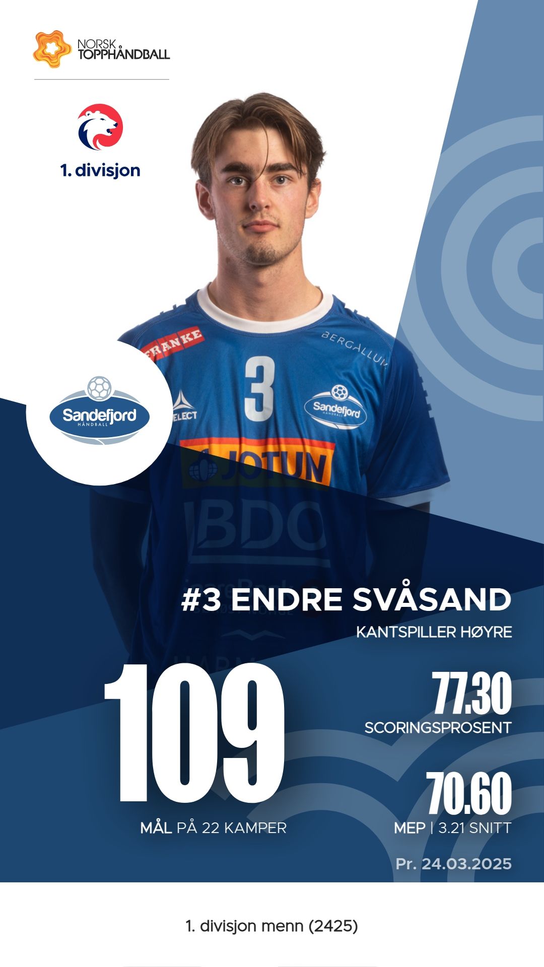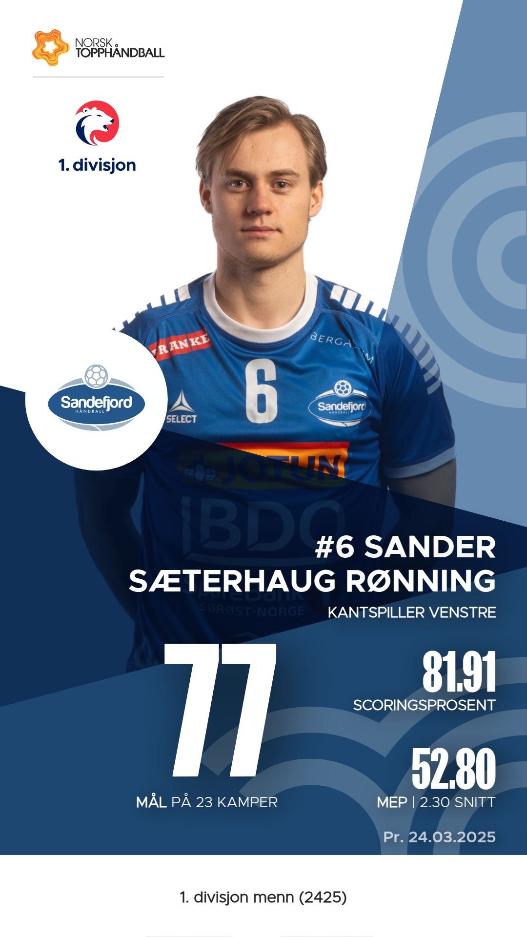 Sandefjord håndball har flere nøkkelspillere som har vist sterke prestasjoner denne sesongen. Endre Svåsand er en av lagets mest effektive spillere med 109 mål og 15 assists, noe som gir ham en M.E.P. på 70.6. Sander Sæterhaug Rønning har også vært viktig med 77 mål, 6 assists og en M.E.P. på 52.8. Martin Lundquist bidrar med 48 mål og 18 assists, og har en M.E.P. på 27.4. I tillegg har Simon Mizera vært en solid målvakt med 132 redninger, noe som understreker hans betydning for laget.