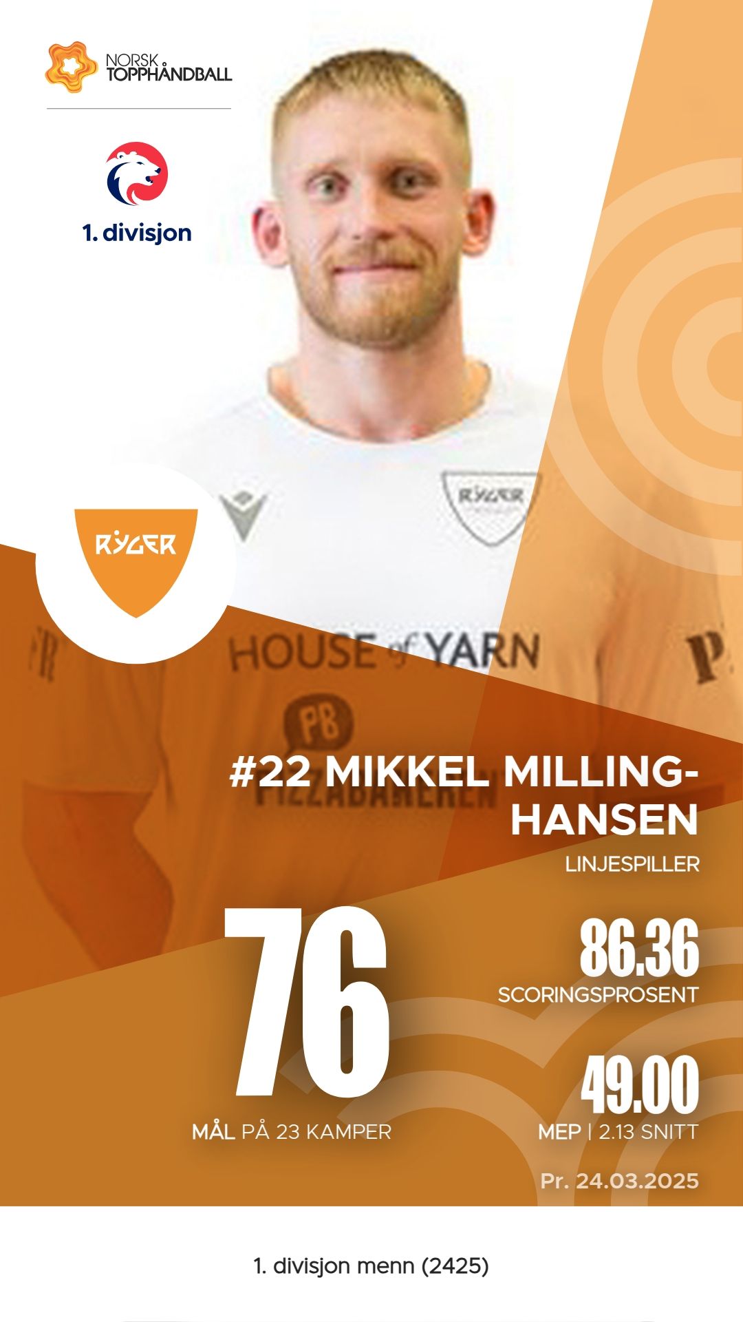 Ryger har flere notable spillere som har bidratt betydelig til lagets prestasjoner i 1. divisjon menn denne sesongen. Sune Ruud har vært en sentral spiller med 99 mål og 79 assists, noe som gir ham en M.E.P. på 60. Mikkel Milling-Hansen har også utmerket seg med 76 mål og 13 assists, samt en M.E.P. på 49. Niklas Tingvik har imponert som playmaker med hele 53 assists, til tross for 41 mål. Theodor Anders Einar Claesson har også vært en viktig spiller med 113 assists, noe som understreker hans rolle i angrepet. Sammen bidrar disse spillerne til Ryger sin konkurranseevne i ligaen.