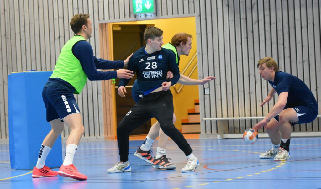 Dette er antakeligvis en av de siste sperrene Lasse L. Thorsbye setter som elitespiller. På trening denne uken viste han at håndballnivået fortsatt er på veldig høyt nivå. På bildet for øvrig: Oskar Olafsson (f.v.), Espen Gommerud Våg og Viktor Petersen Norberg. Foto Roy Johnsen.