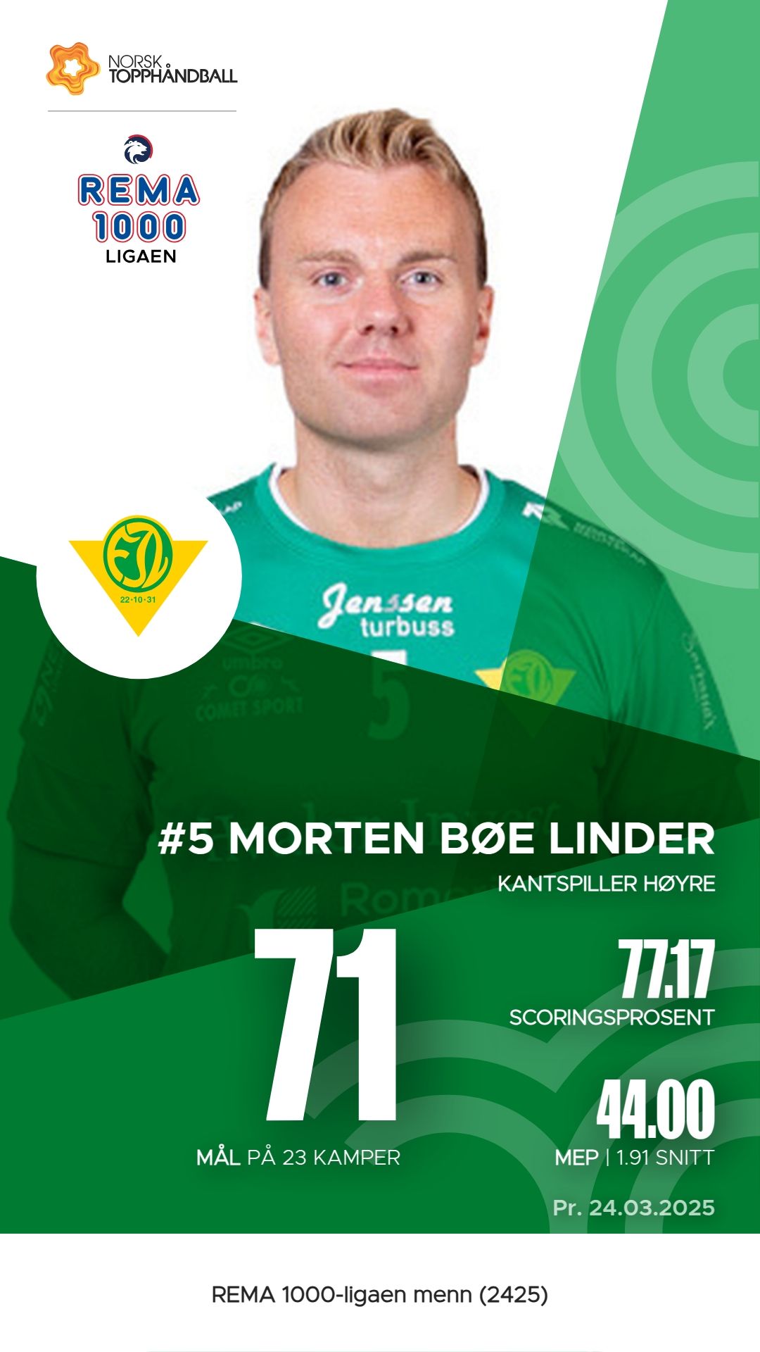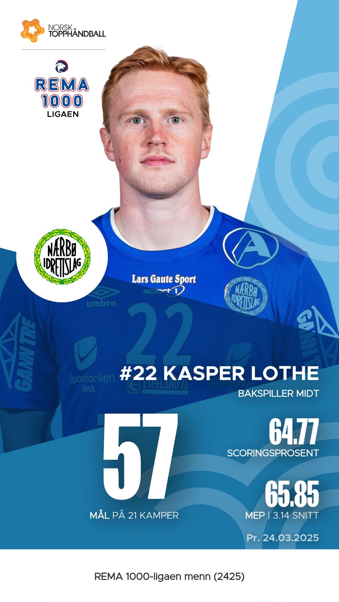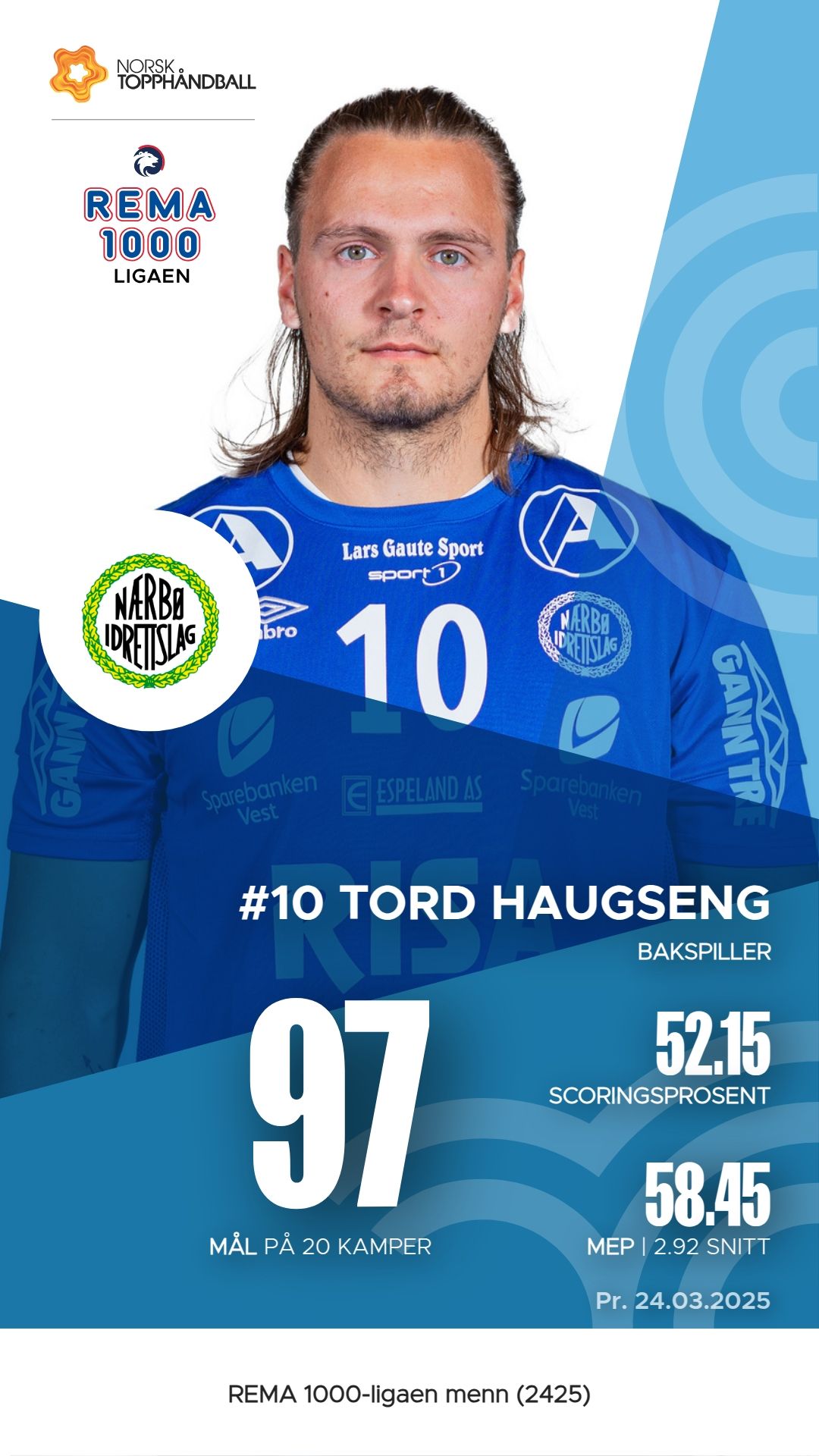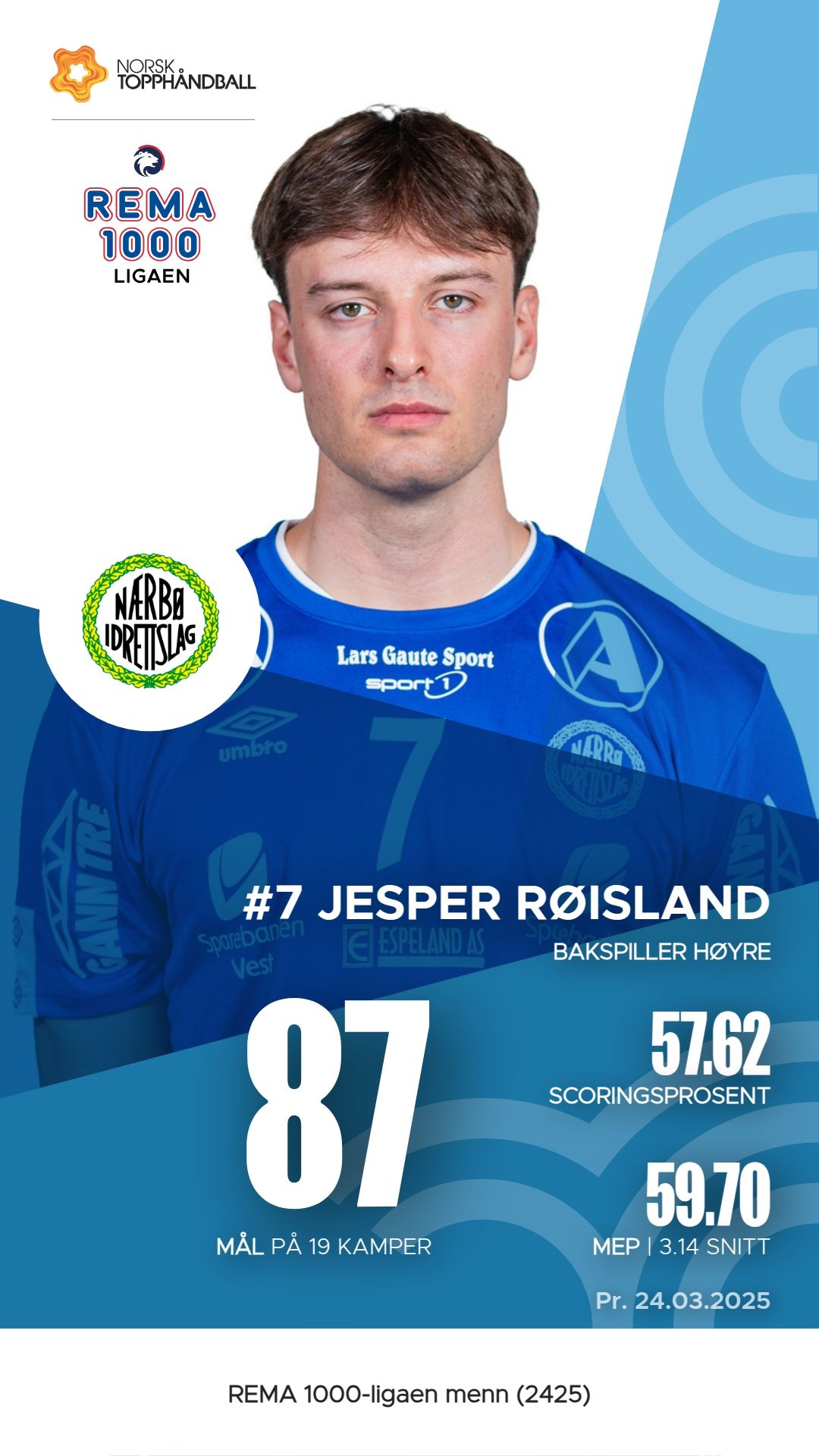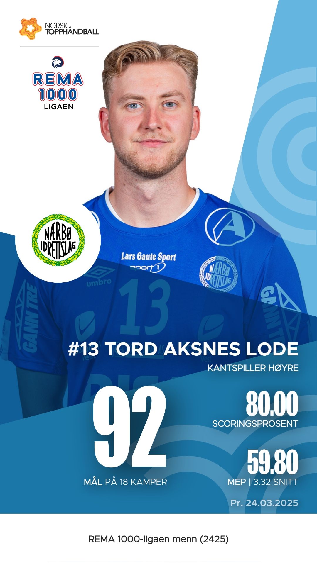Nærbø har flere nøkkelspillere som har utmerket seg i REMA 1000-ligaen denne sesongen. Tord Aksnes Lode har vært en viktig bidragsyter med 92 mål og 4 assists, noe som gir ham en M.E.P. på 59.8. Jesper Røisland følger tett etter med 87 mål og 81 assists, og en M.E.P. på 59.7. Tord Haugseng har også vist sin betydning med imponerende 97 mål og hele 85 assists, samt en M.E.P. på 58.45. Kasper Lothe har bidratt med 138 assists og en M.E.P. på 65.85, noe som gjør ham til en av de mest effektive spillerne i laget.