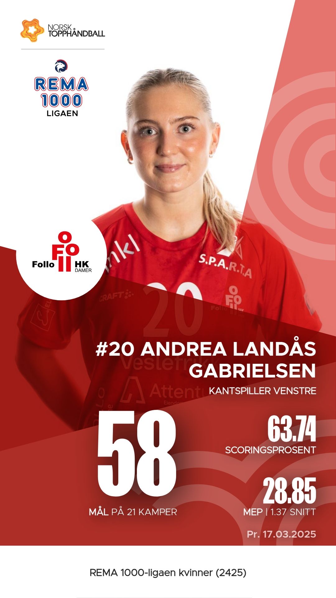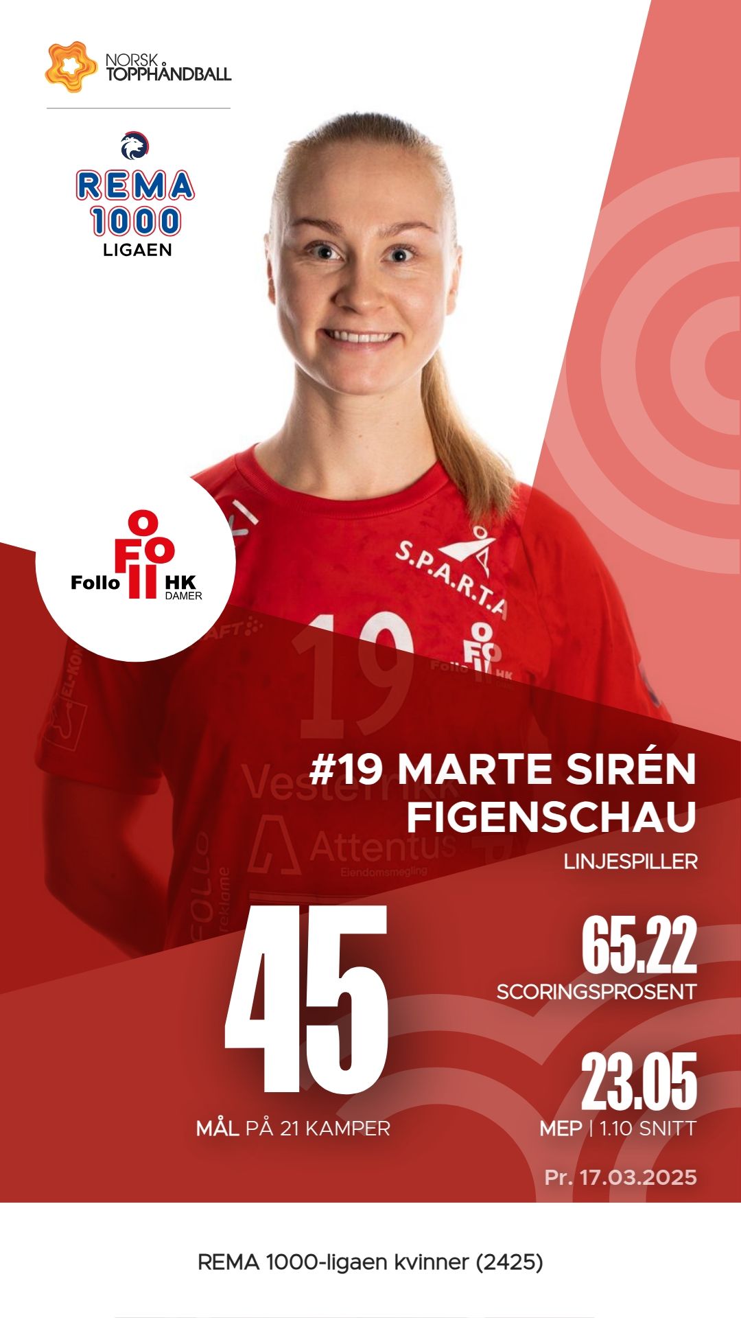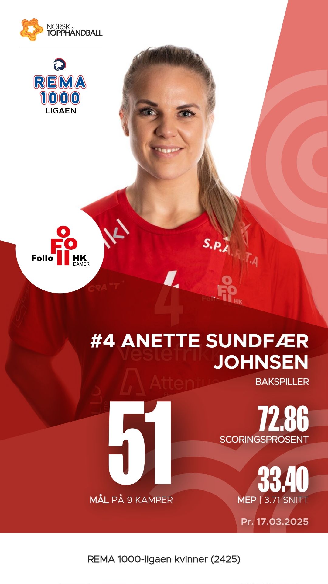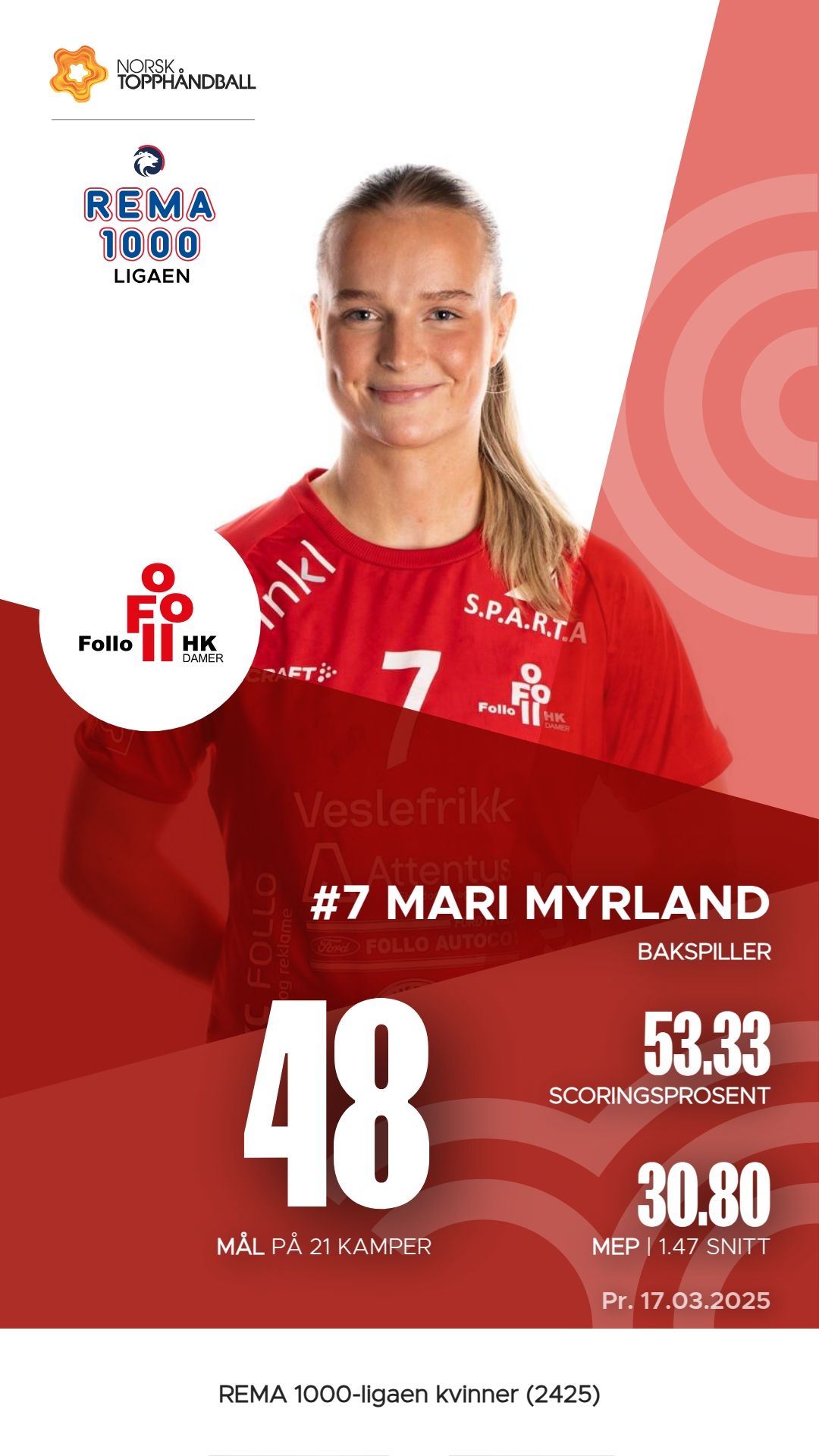 Follo Damer har flere fremragende spillere som har bidratt betydelig til lagets prestasjoner i REMA 1000-ligaen. Andrea Landås Gabrielsen har scoret 58 mål på 91 skudd, noe som gir henne en M.E.P. på 28,85. Mari Myrland har også utmerket seg med 48 mål og imponerende 64 assists, noe som resulterer i en M.E.P. på 30,80. Anette Sundfær Johnsen og Marte Sirén Figenschau har også vært viktige bidragsytere med henholdsvis 45 mål og 5 assists, og 45 mål med 16 straffeslag. Disse spillerne har vært sentrale i lagets spill og resultater så langt i sesongen.