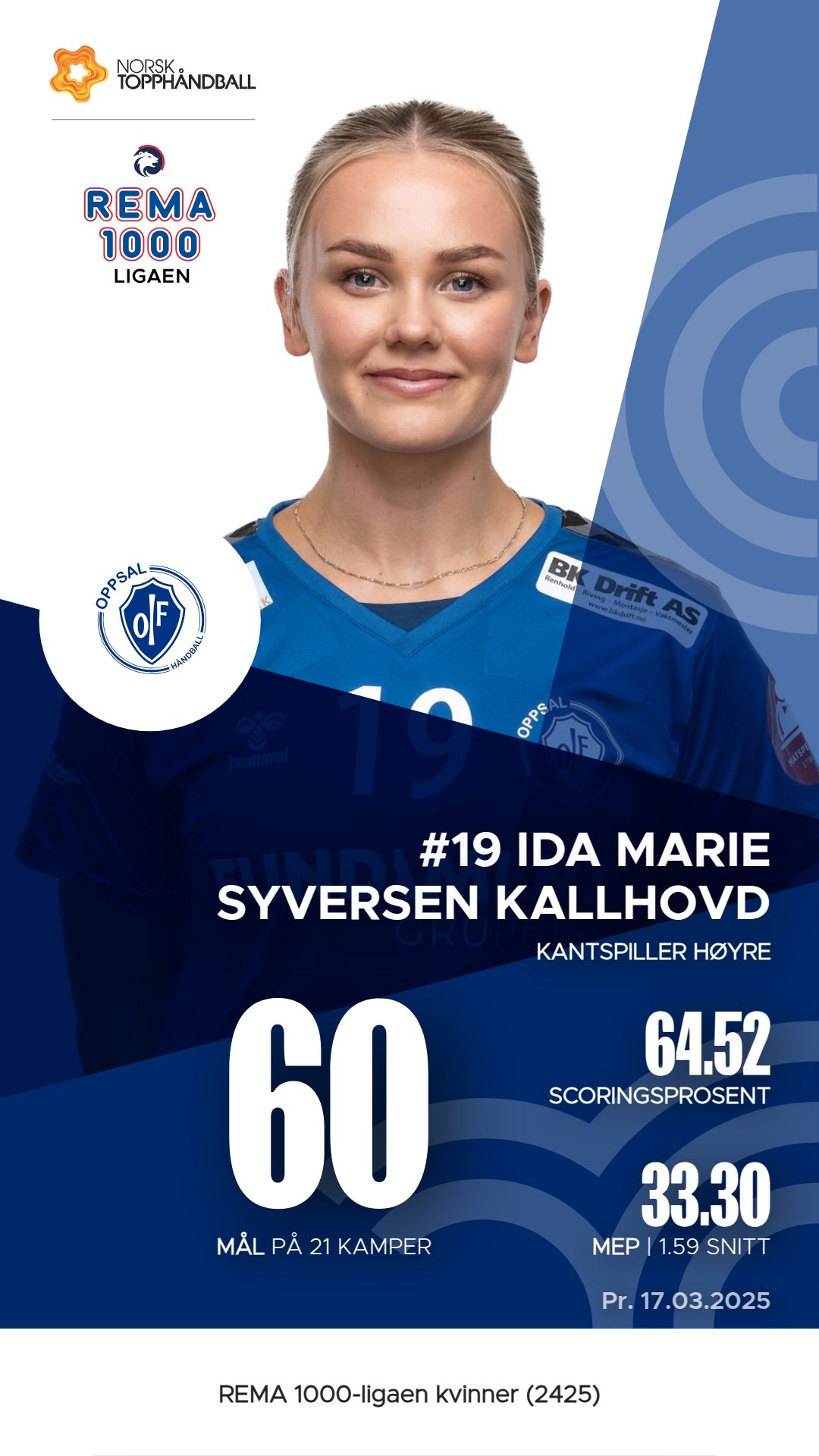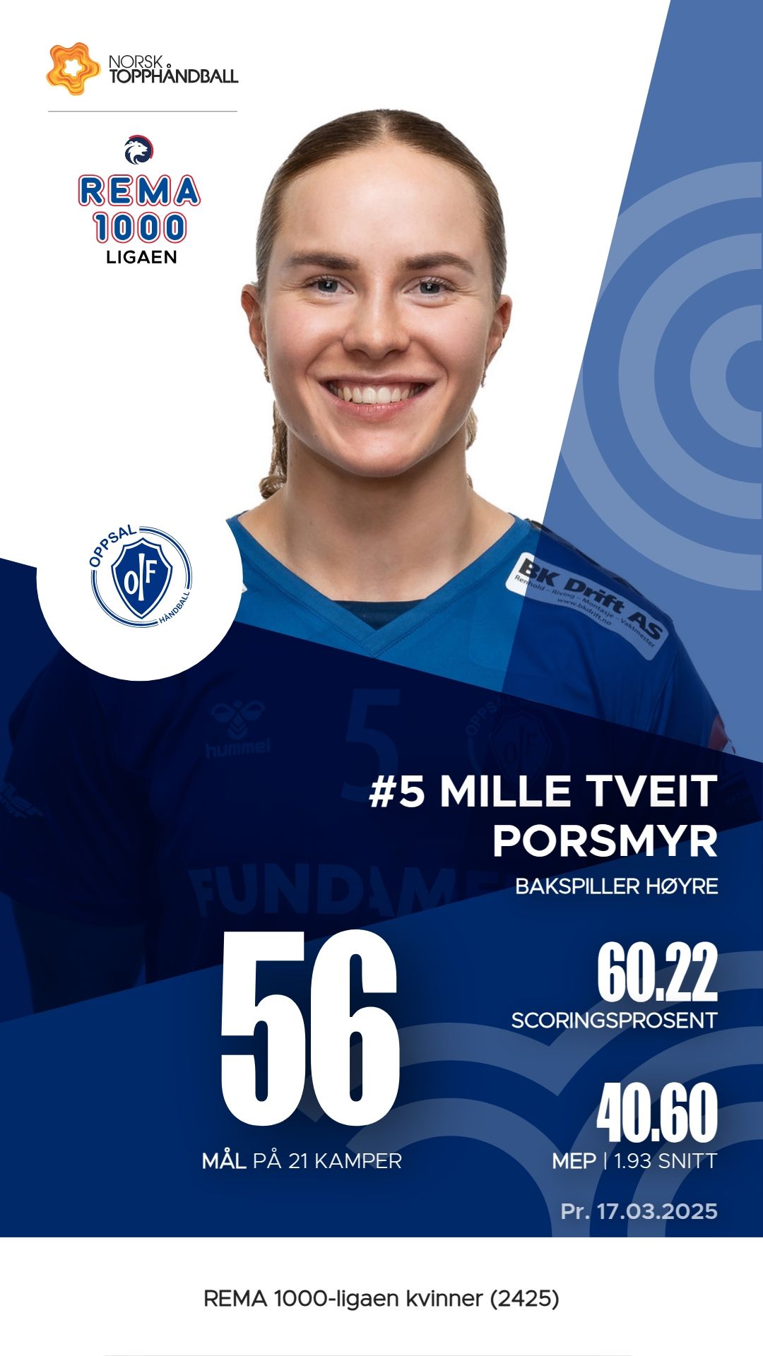 Oppsal har flere bemerkelsesverdige spillere i REMA 1000-ligaen kvinner denne sesongen. Mille Tveit Porsmyr har utmerket seg med 56 mål og 49 målgivende pasninger, noe som gir henne en M.E.P. på 40.6. Ida Marie Syversen Kallhovd følger tett etter med 60 mål, selv om hun har 30 skudd som ikke traff målet, og hennes M.E.P. er 33.3. Hanna Karoline Hernes Gåsvær har også vist sterke prestasjoner med 53 mål og 48 assists, som gir henne en M.E.P. på 35.4. Disse spillerne har vært sentrale for lagets angrepsspill og har bidratt til Oppsals resultater i ligaen.
