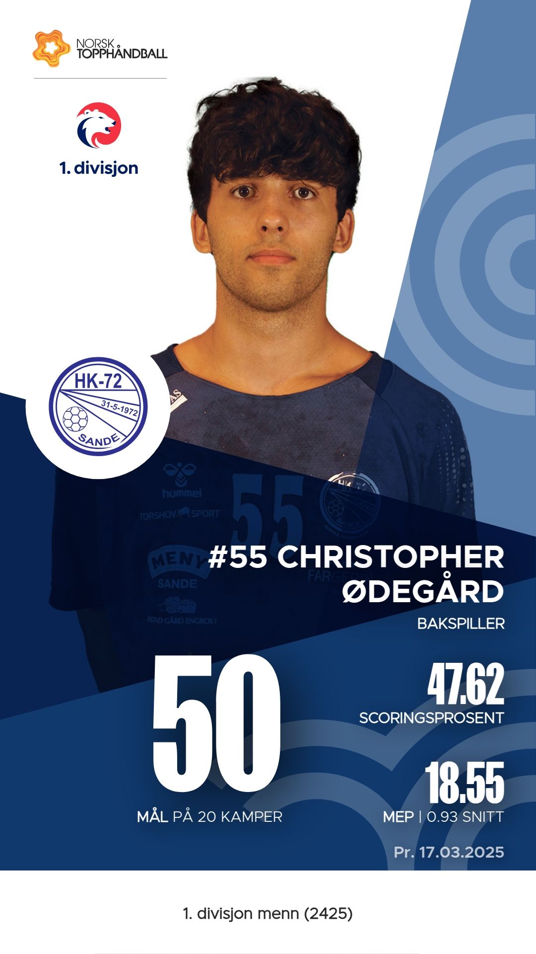 HK-72 Sande har flere markante spillere i troppen denne sesongen. Christoffer Hartz Hagen er en av de mest fremtredende, med 100 mål og 80 assists, noe som gir ham en M.E.P. på 60,55. Ola Sønju Eggum har også gjort en solid innsats, med 65 mål og 52 assists, samt en M.E.P. på 36,7. Theodor Wilhelmsen Sjøgrem har bidratt med 60 mål og 13 assists, og har en M.E.P. på 33,65. Christopher Ødegård har også vist seg som en viktig spiller med 50 mål og 23 assists. Disse spillerne har vært sentrale i lagets prestasjoner i 1. divisjon menn.