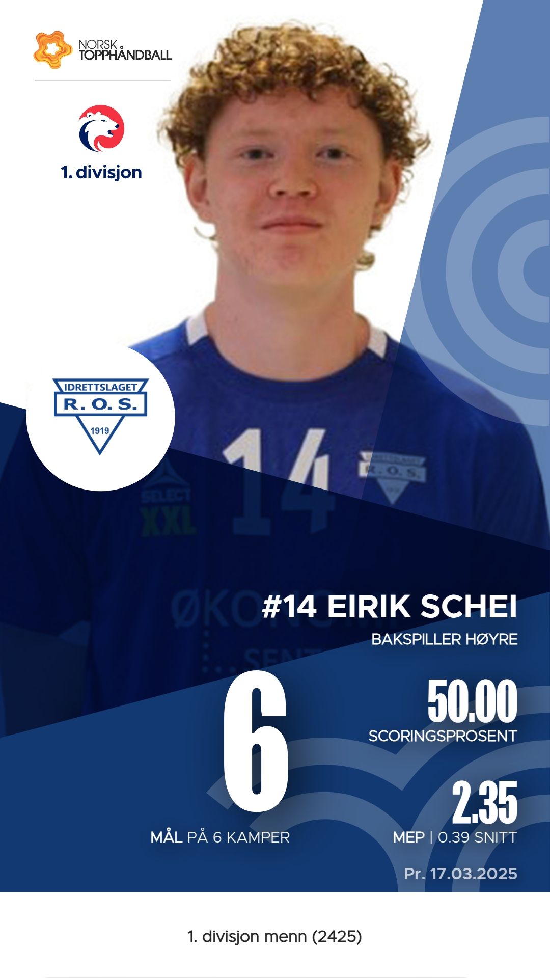 Ros har flere fremtredende spillere i 1. divisjon menn. Niclas Rødal er en av de mest effektive, med 125 mål fra 176 skudd, noe som gir en høy M.E.P. på 74,55. Jacob Jensen Rodahl bidrar også sterkt med 56 mål og 92 assists, og har en M.E.P. på 45,10, som viser hans viktige rolle i angrepet. Eirik Schei har vært en solid spiller med 6 mål og 5 assists, selv om han ikke har nådd samme scoringshøyder som Rødal. Disse spillerne er sentrale for Ros sin prestasjon i turneringen.