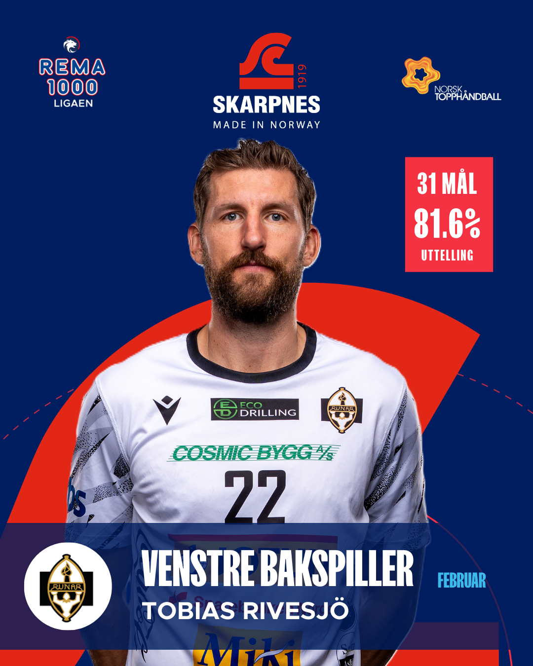 Tobias Michael Rivesjö har vært en motor i Runars angrepsspill gjennom hele måneden. 31 mål på fem kamper, et målsnitt på 6,2 og en uttellingsprosent på 81,6 er sterke tall i seg selv. Når han i tillegg noterer seg for hele 35 assists og et snitt på 5,0 i MEP, sier det mye om hvor sentral han har vært. Rivesjö kombinerer egen avslutningsstyrke med blikk for medspillerne på en måte få andre gjør.