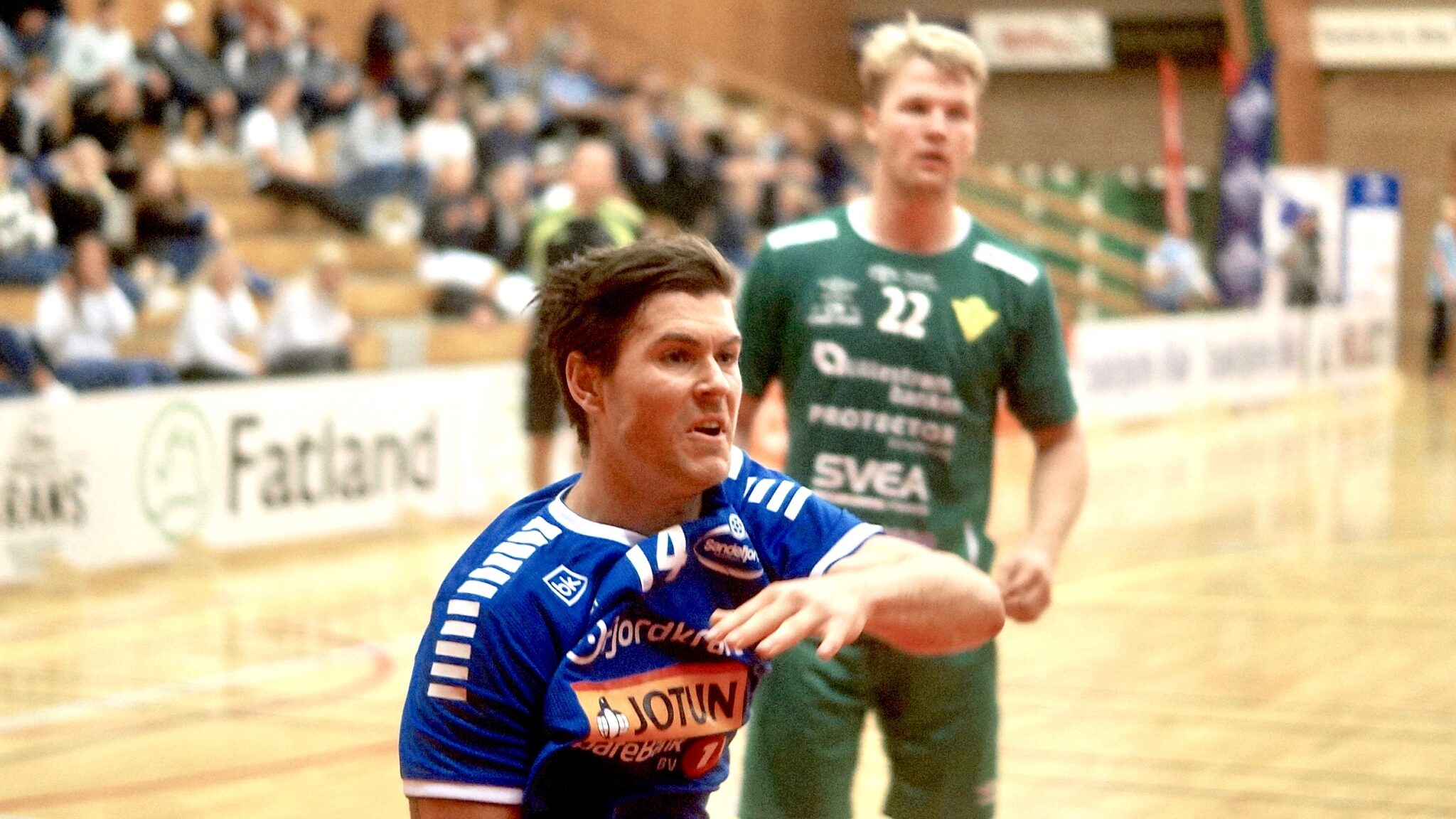 I år så det ut til å bli akkurat det samme. Lagene fulgte hverandre som skygger i 1. omgang. Fjellhammer klarte ved et par anledninger å komme både tre og fire mål foran, men hvor lenge var Adam i Paradis? De blå strammet opp forsvaret, finstilte skuddarmen og hentet seg inn igjen til 16-16 ved halvtid.