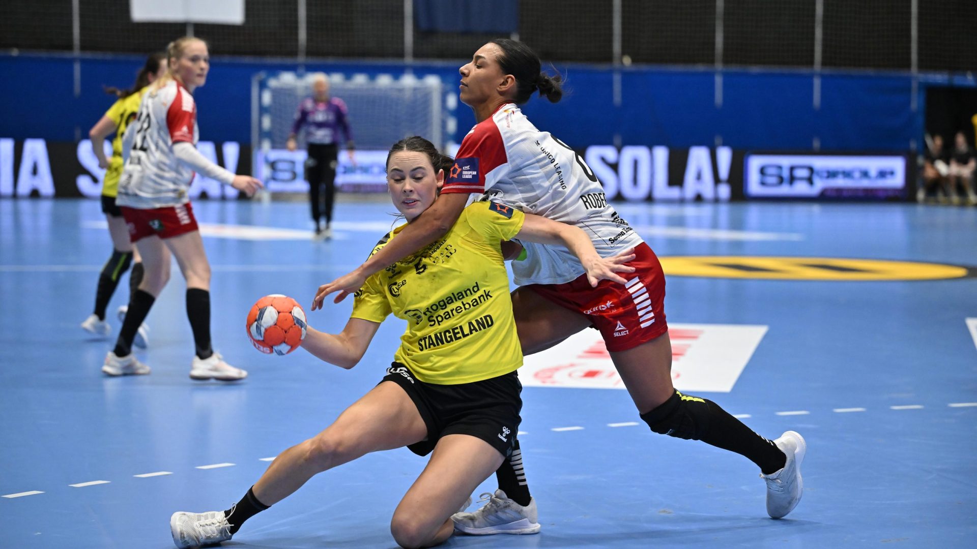 Første omgang startet godt da Camilla Herrem startet scoringsballet etter 3 minutter. Publikum fikk ikke se en ny scoring før i det 7 minutt, da Camilla satt 2-0. Lagene fulgte hverandre jevnt og etter 15 minutter sto det 7-7. Herfra fikk Sola-jentene et lite grep om kampen, og ledet med 3 mål etter 21 minutter spilt. På tross av dette, tok det ikke mer enn 5 minutter, så var ledelsen spist opp. Til pause var lagene like langt på stillingen 14-14.