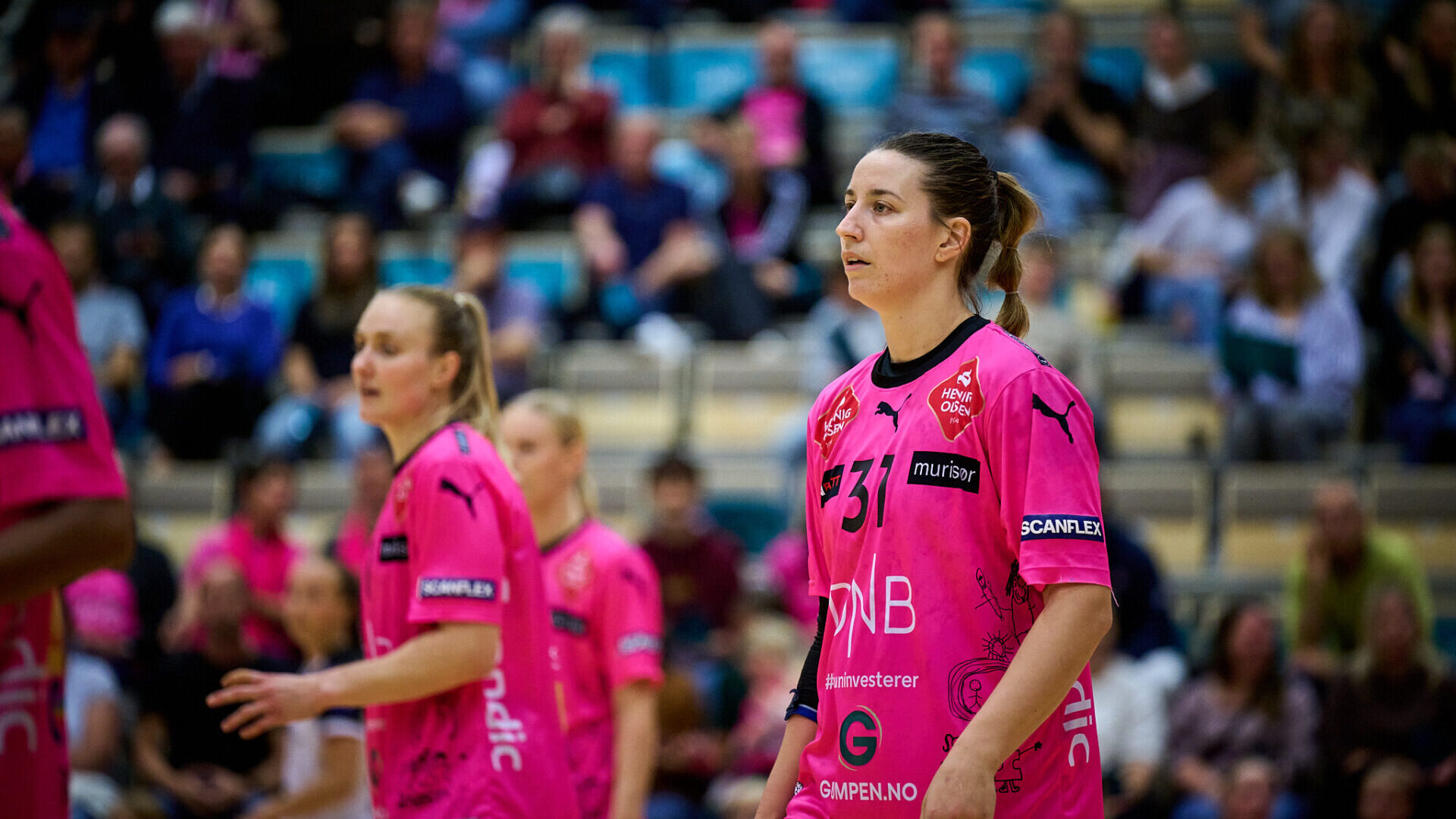 Også Mia Emmenegger noterte seg for sin første scoring i Aquarama da hun økte til 15-8, og rett før pause fikk de rosa et syvmeterkast som Nina Koppang ekspederte i mål. Da sto det 19-9 på lystavla, og Tomas Hlavaty kunne ta med seg jentene i garderoben for en hyggelig prat før de siste 30 minuttene.
