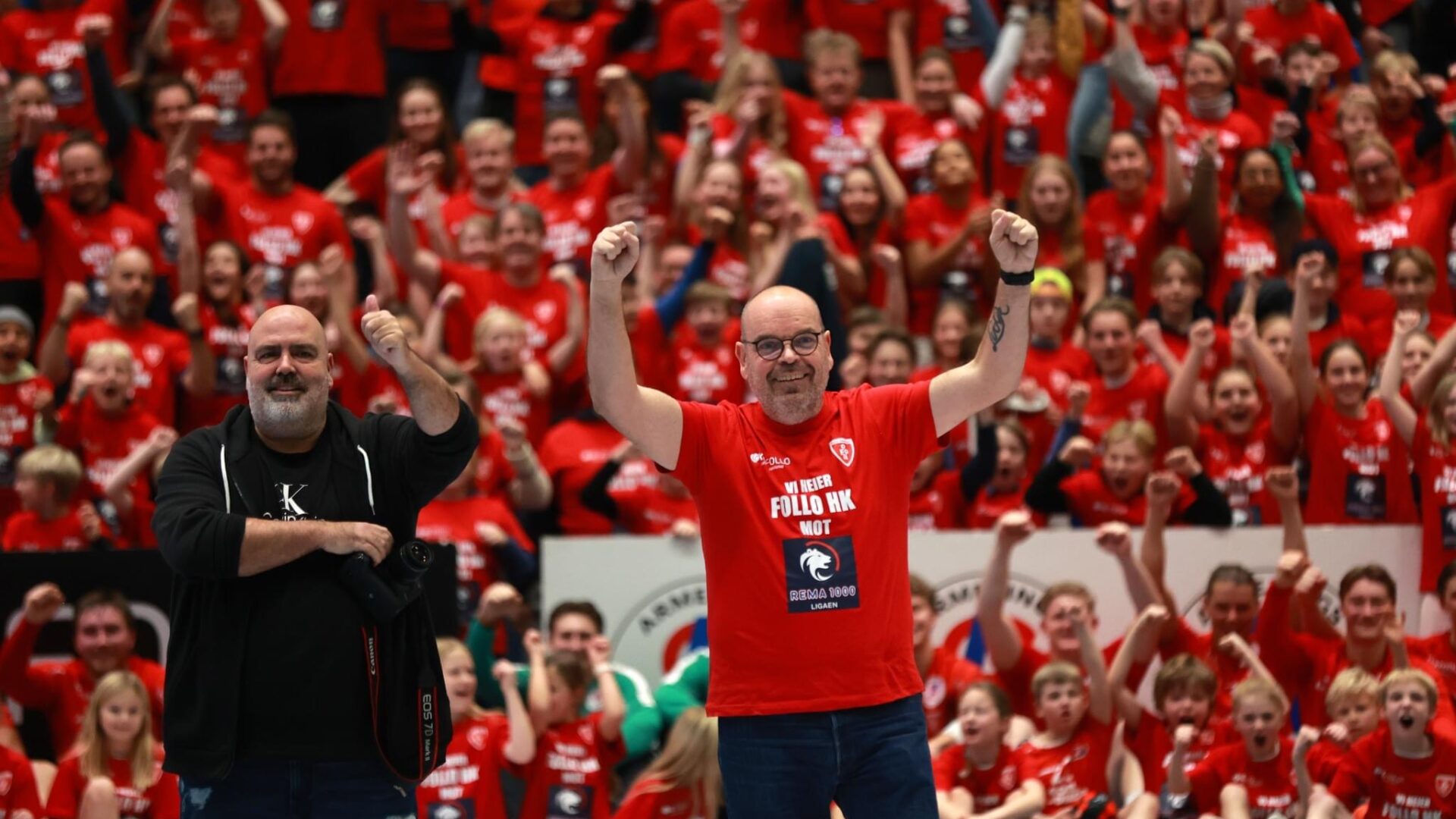 Tungvekterne fra Østlandets Blad, Knut Stenseth og Magnus Gulliksen, jubler med publikum etter kampen mellom Follo HK og Fyllingen. Foto: Tor Solstad/Follo Media