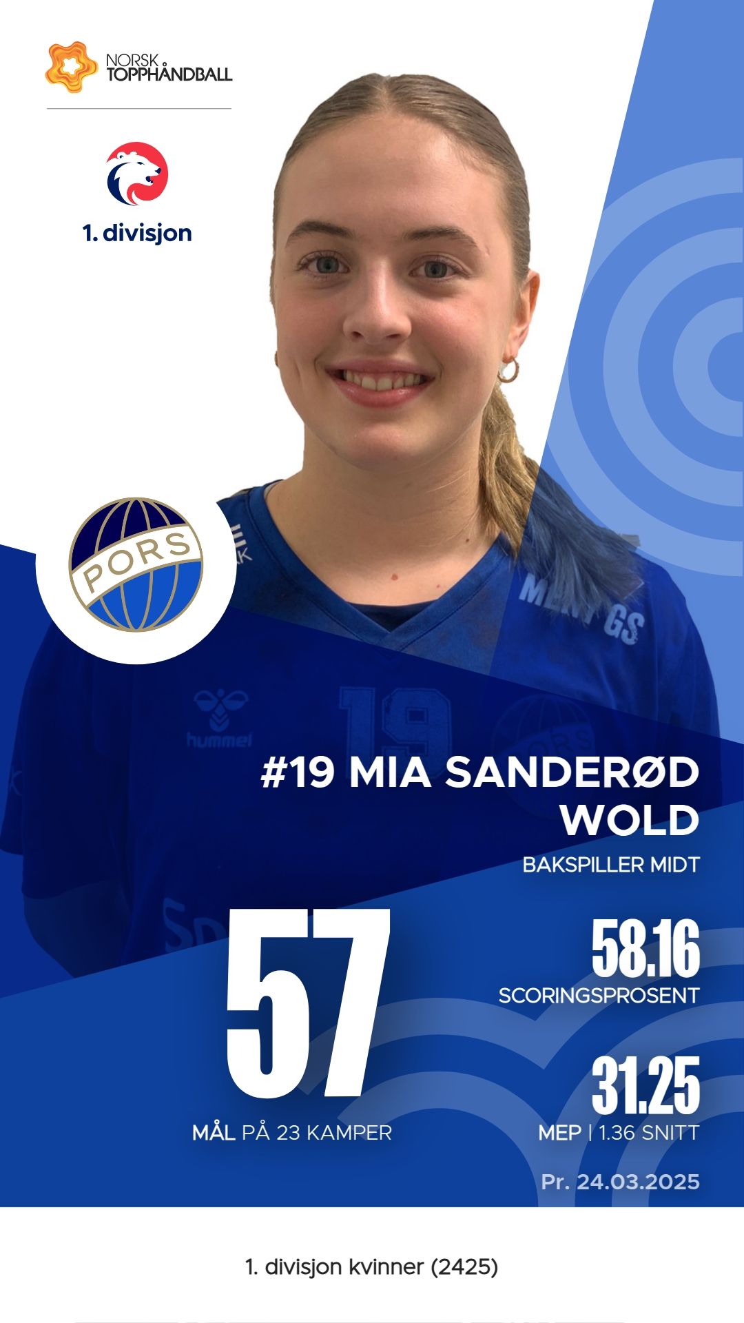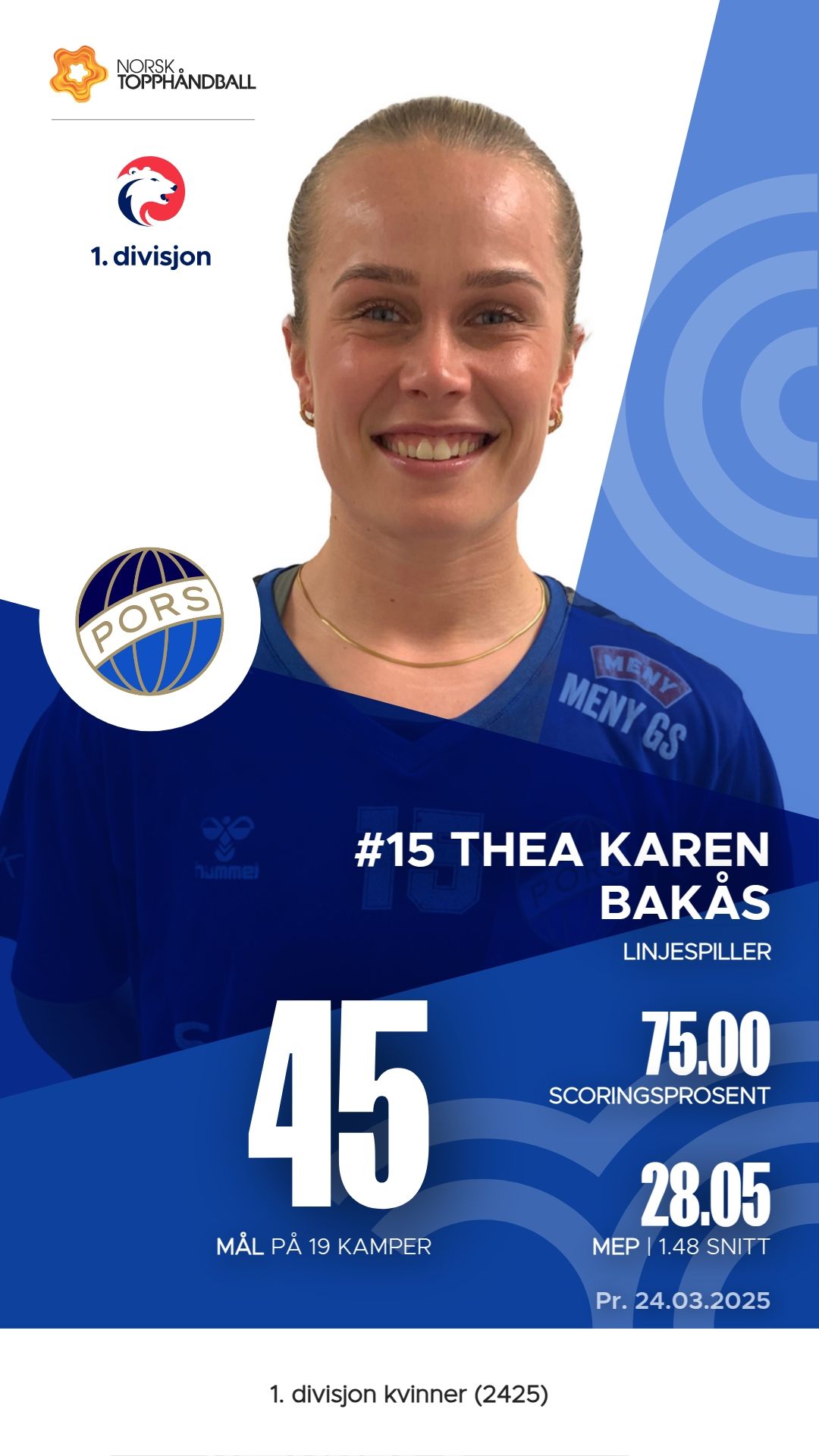 Pors har flere nøkkelspillere som har utmerket seg i 1. divisjon kvinner denne sesongen. Mia Sanderød Wold er en av de mest effektive, med 57 mål og 40 assists, noe som gir henne en M.E.P. på 31,25. Dorthe Groa følger tett etter med 55 mål og 28 assists, samt en M.E.P. på 30,15. Thea Karen Bakås har også vært solid med 45 mål og 7 assists, noe som gir henne en M.E.P. på 28,05. Disse spillerne har vært viktige bidragsytere til lagets prestasjoner og har vist en høy grad av effektivitet gjennom sesongen.